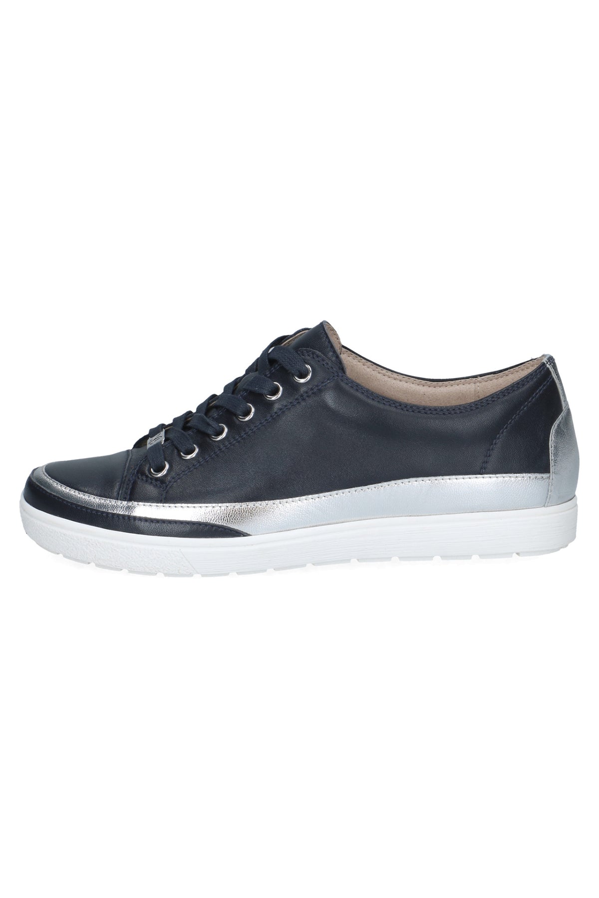 Caprice 9-23654-42-880 Navy Silver Ocean Comb Trainers combine sleek style with everyday comfort. Crafted from smooth navy leather with metallic silver accents , these trainers feature a classic lace-up design and a flexible white sole for easy movement. The cushioned insole ensures all-day comfort, making them perfect for both casual and smart-casual outfits.