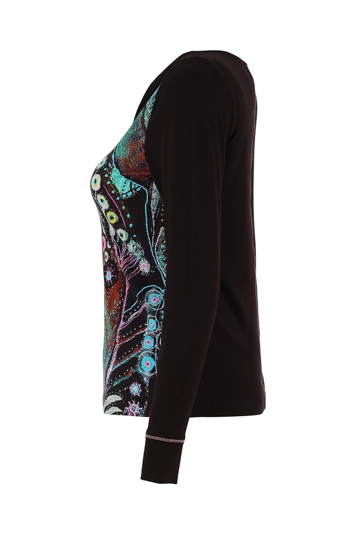 Bring artistic elegance to your wardrobe with the Dolcezza 75722 Laurie DeVault Blue Enchanted Island Print Top, a striking piece that captures the serenity and vibrancy of Laurie DeVault’s imagined landscapes. The front showcases a dreamy blend of turquoise, blush, and earthy tones in abstract brushwork, while the back offers sleek simplicity in solid black—balancing bold expression with refined structure.