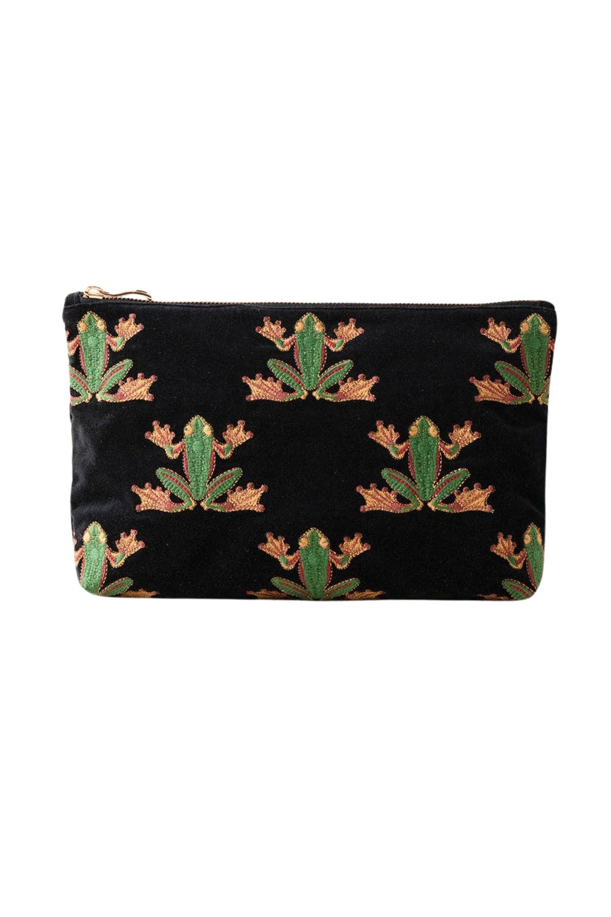 Jump-start your daily routines or make a playful statement with this embroidered frog design, featuring striking jade and gold threads against a charcoal velvet base - perfect for those who are always on the move. Designed to make your life a little more organised and a lot more luxurious, this timeless Everyday Pouch features delicate embroidery on a soft, durable base.