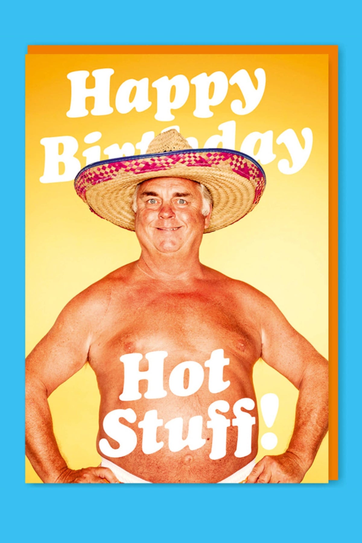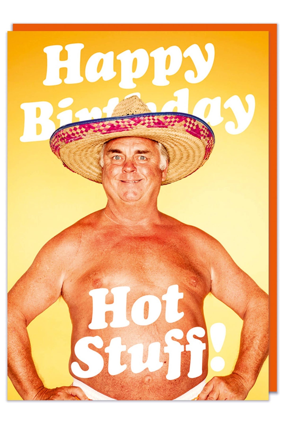 Does this card's guy look familiar? If they resemble a seasoned Benidorm beach legend (just like me), this card could be perfect. Don’t forget plenty of factor 50 and maybe skip the sombrero. Featuring a cheeky photo of a sunburnt, middle-aged, topless man grinning in a funny sombrero, with bold white text declaring: Happy birthday hot stuff. Blank inside for your own message.