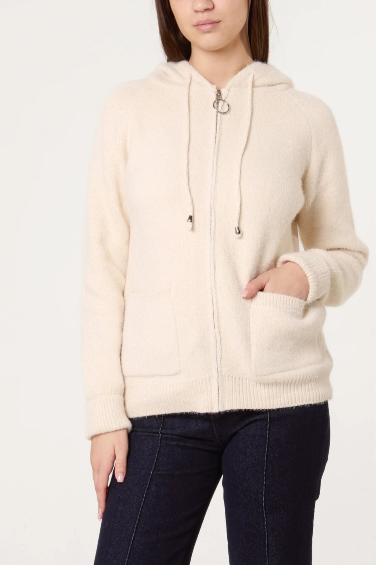 Wrap yourself in pure comfort with this gorgeous Cream zip cardi hoodie! Crafted from irresistibly soft, fluffy knit fabric, it's the ultimate cosy companion for chilly days. The convenient front zip closure makes it effortless to layer over your favourite outfits, whether you're heading out or settling in at home. Snuggle up in style and discover why this piece is destined to become your go-to favourite.