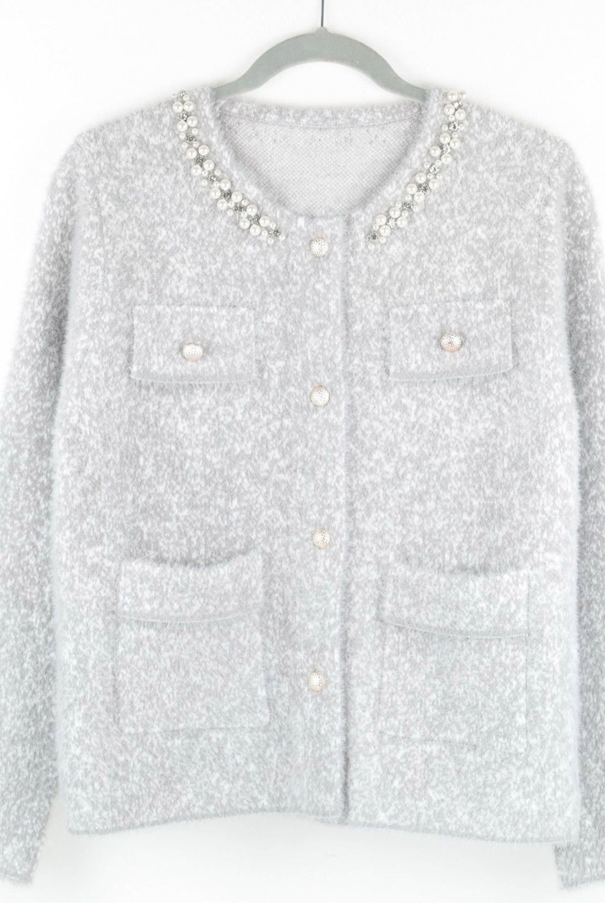 Wrap yourself in effortless elegance with our Evening Luxe Pearl-Collar Cardigan, a beautifully crafted layer that brings instant polish to any outfit. Spun from an ultra-soft, cloud-like knit, this one-size piece (fitting up to UK 14) delivers that cosy, cocooning feel while still looking undeniably refined. The standout feature? A dazzling neckline embellished with faux pearls and glittering rhinestones—catching the light with every move and giving even your simplest jeans-and-tee look a touch of glamour. Finished with chic pearl-style buttons and practical pockets, it’s the kind of cardigan that makes you smile the moment you slip it on.