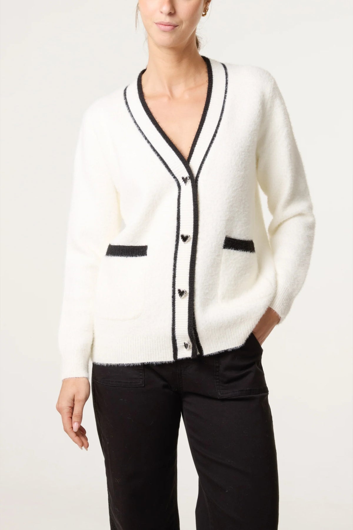 Discover the magic of comfort with this Snow White Heart Button Cozy Cardigan—your new go-to layer for cosy days ahead. The elegant v-neckline is wonderfully flattering, while the dreamy eyelash knit texture adds a touch of luxury to your everyday wear. Handy front pouch pockets keep your hands toasty and your essentials within reach. With its enchanting heart buttons and undeniably chic silhouette, this cardigan is pure joy wrapped in warmth.