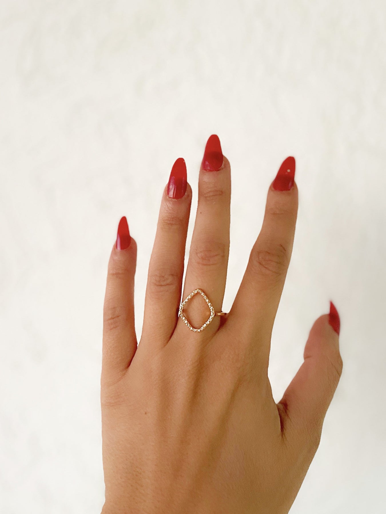The Jamie Luxe ring, plated in 18k gold, exudes modern sophistication. Featuring a unique open-square design, this piece is elegantly adorned with delicate crystal accents that capture and reflect light with every movement. A statement of understated luxury, the hollow shape adds a contemporary twist, while the jewel-studded perimeter offers a touch of glamour. Perfect for adding a refined finish to both day and evening ensembles, the Jamie Luxe ring is designed for those who appreciate minimalist style with a touch of brilliance.