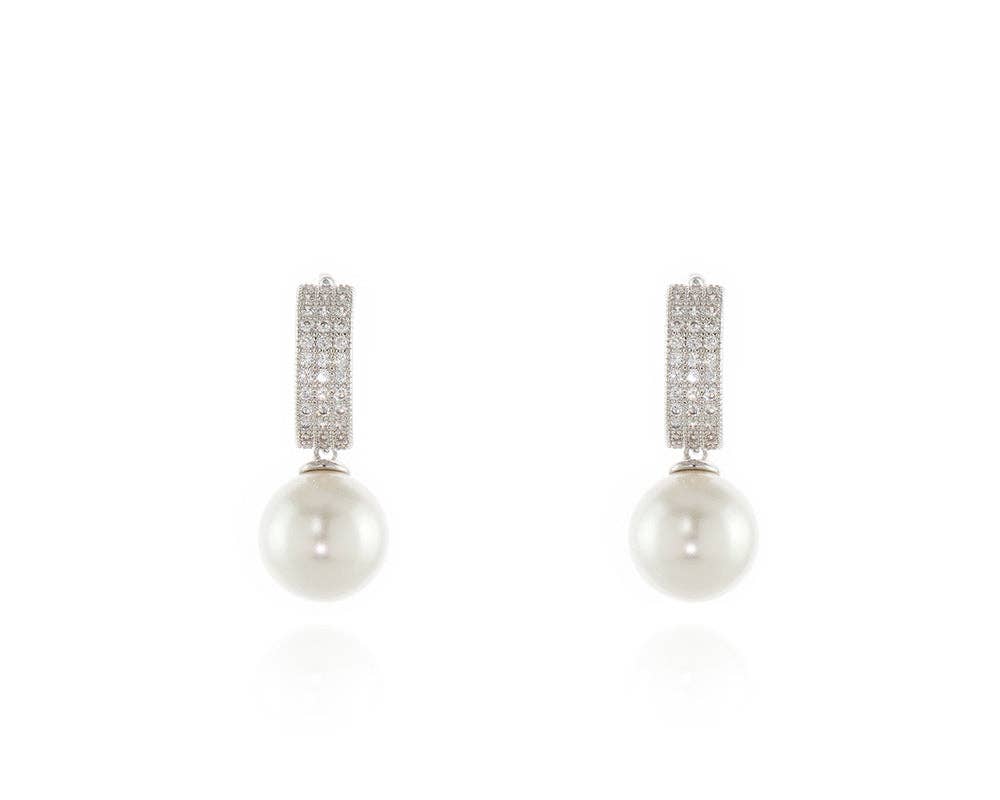 Elevate your style with these elegant pearl drop earrings. Each earring features an section of brilliant-cut CZ stones set at the post, from which a delicate pearl dangles gracefully creating a sophisticated yet versatile accessory.