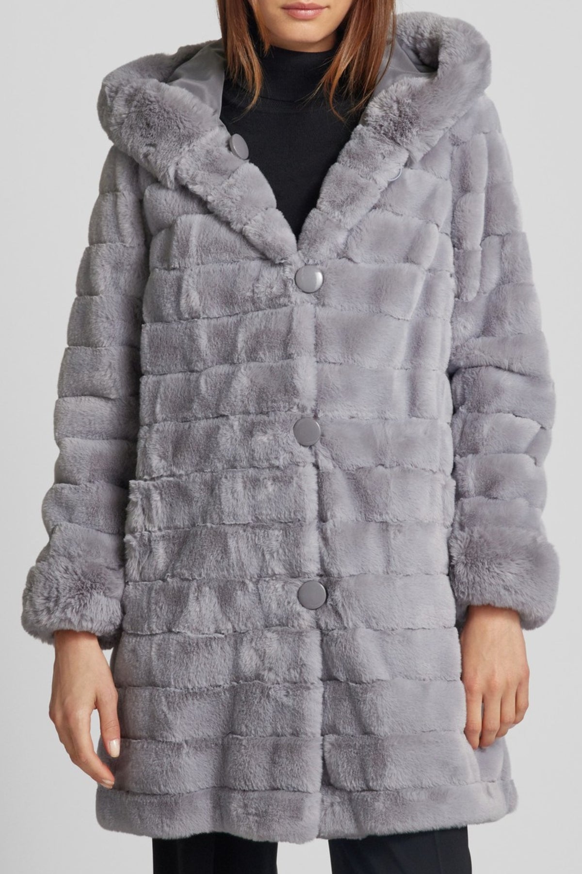 • Reversible design: plush Silver grey faux fur and matte grey shell