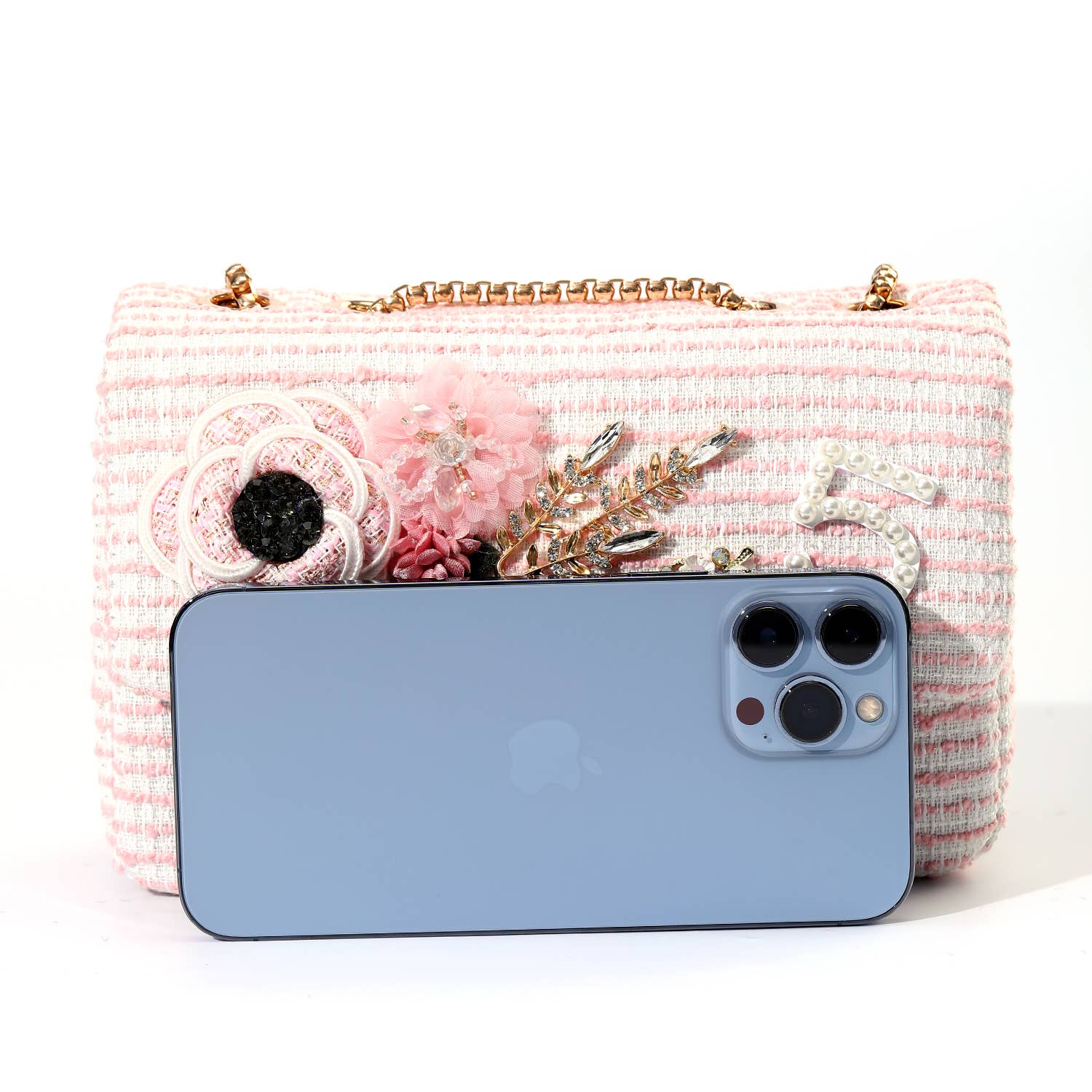 Get ready to receive compliments and catch everyone's attention as you carry around this trendy and adaptable tweed bag. With its detailed floral applique and pearl decorations, it exudes a whimsical retro vibe that is bound to make a splash. Plus, the adjustable chain strap allows for endless possibilities in personalising your look.