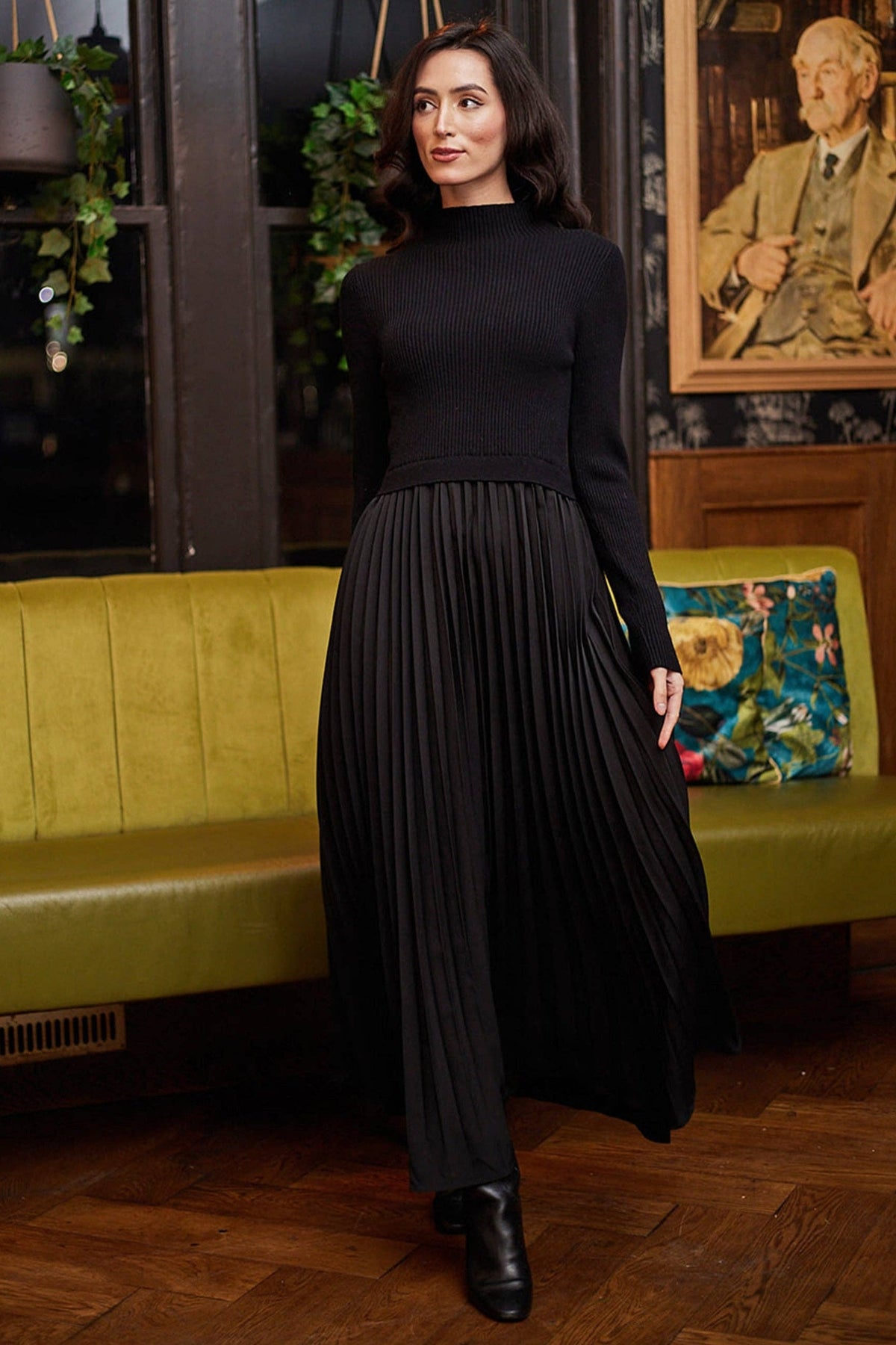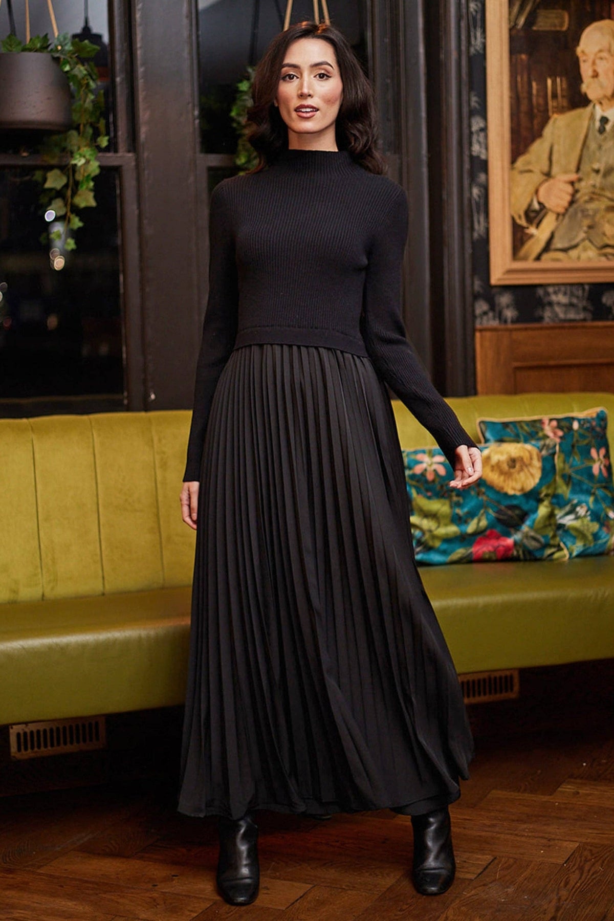 Black Knit Top and Pleated Skirt Maxi Dress
