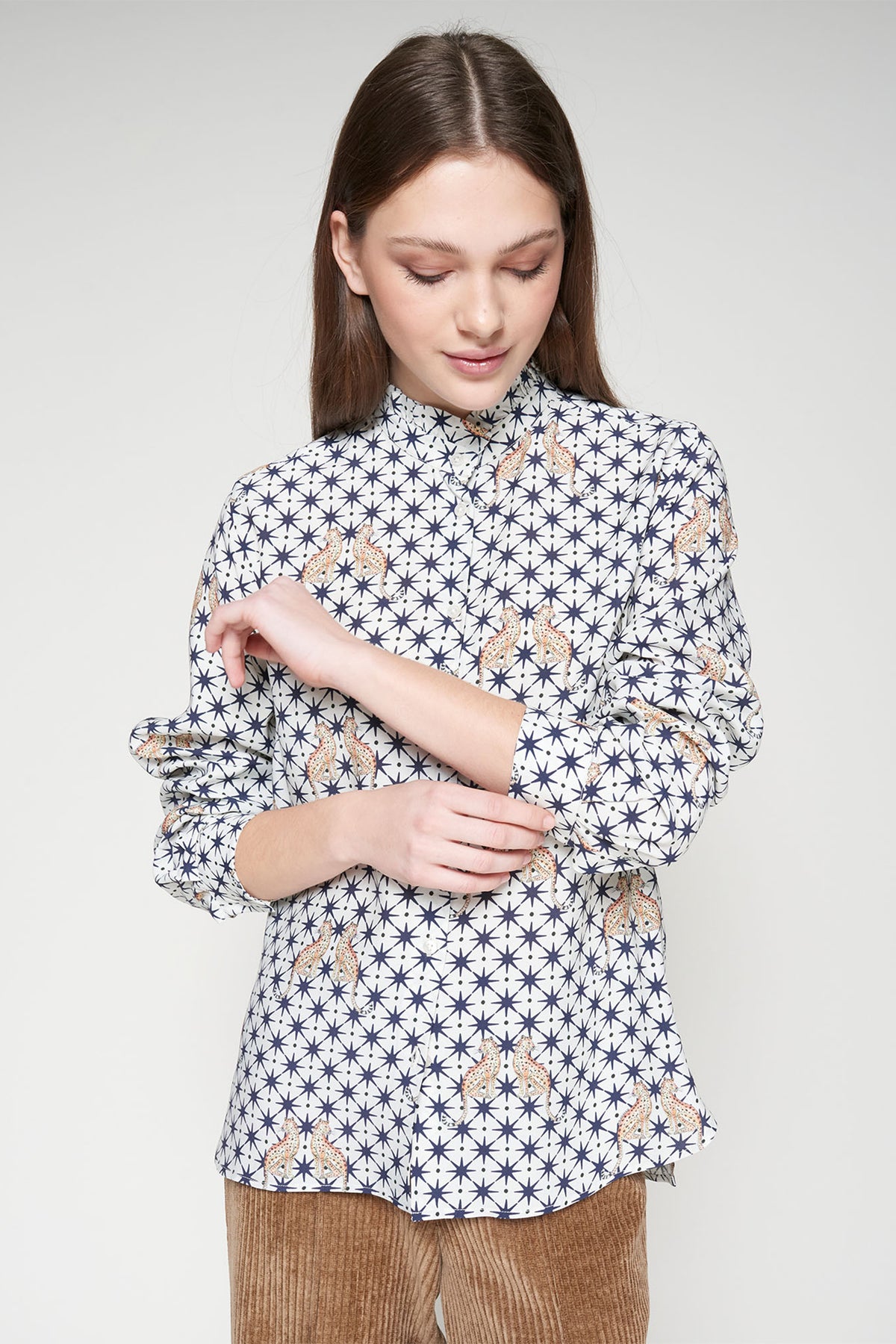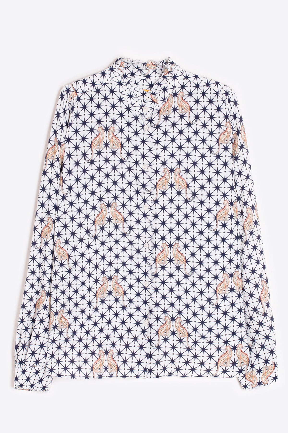 A playful twist on a classic silhouette, the Vilagallo 32979 Andy White Navy Leopard Print Star Shirt combines crisp white with an all‑over pattern of navy stars and hand‑drawn leopard motifs. Cut in a straight fit from fluid viscose, it features a high collar with subtle ruffle, button‑through front, and long sleeves finished with buttoned cuffs for a polished edge.
