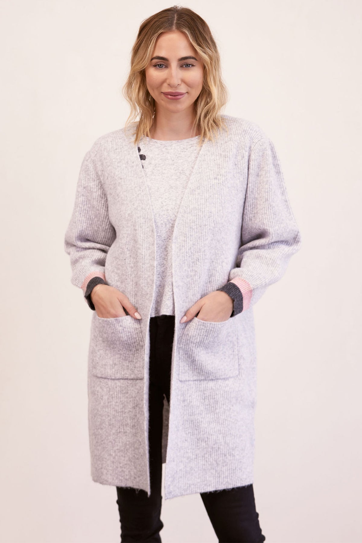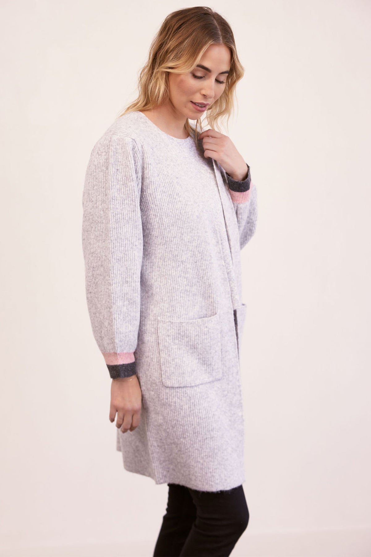 A tonal layer with playful contrast, the Kaleido K14 Silver Open Front Cardigan blends soft texture with sculptural ease. Its relaxed silhouette and colour-block cuffs offer a directional twist on everyday knitwear.