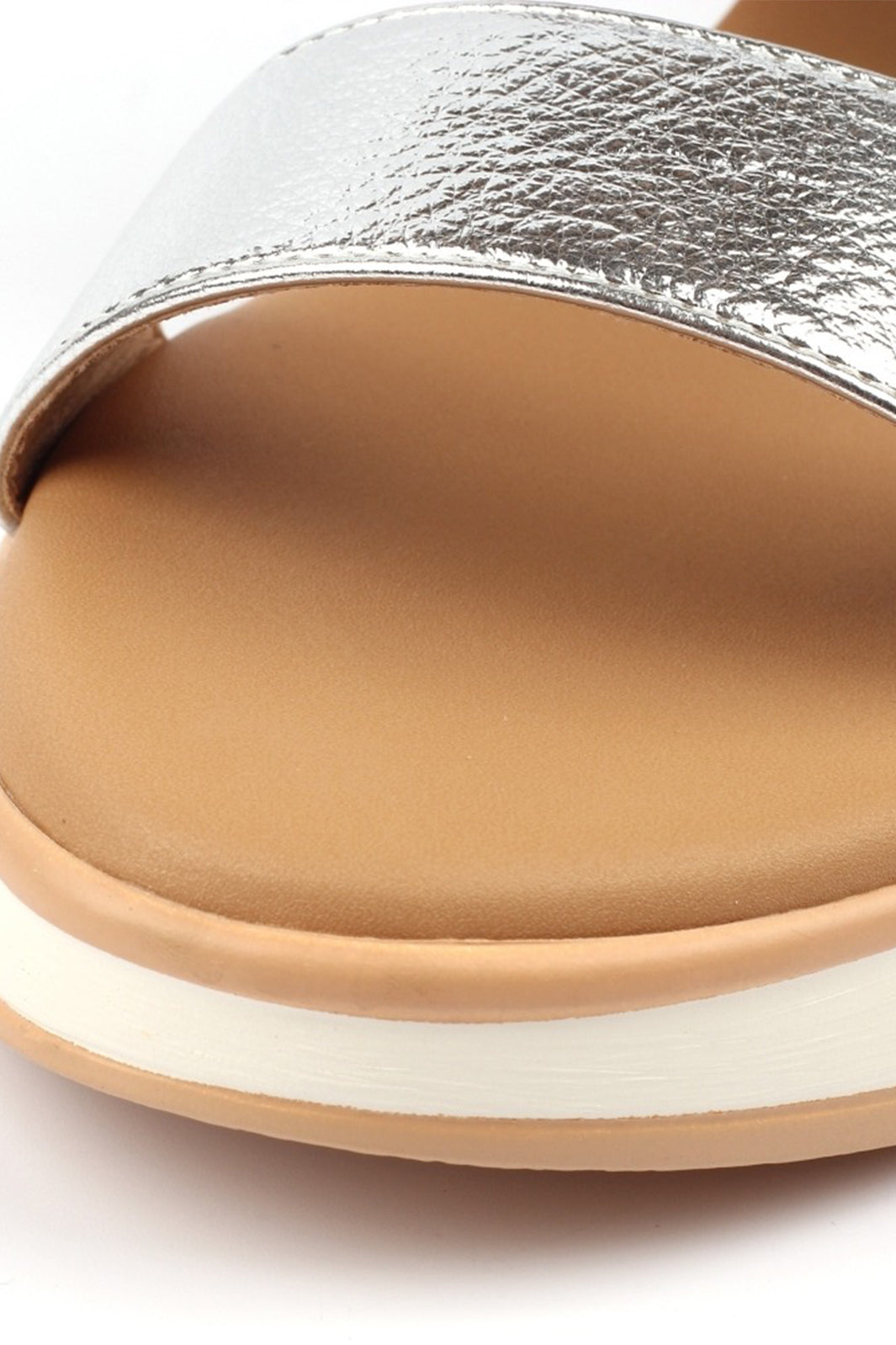 - Metallic front strap for a subtle pop of shine