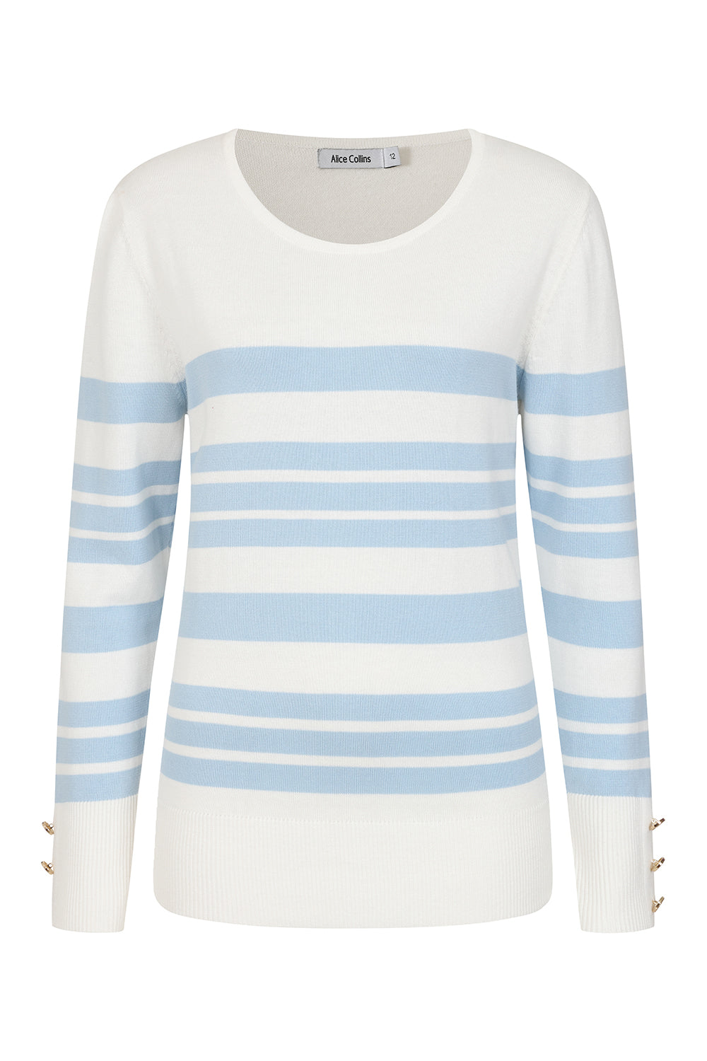 Fresh, easy and perfect for everyday wear, the Alice Collins 036S632 Jemima White Sky Blue Stripe Jumper brings a clean nautical feel to your knitwear collection. Designed in crisp white with soft sky blue stripes, it’s finished with a flattering scoop neckline and long sleeves, plus subtle gold-tone button detailing at the cuffs for a polished touch.