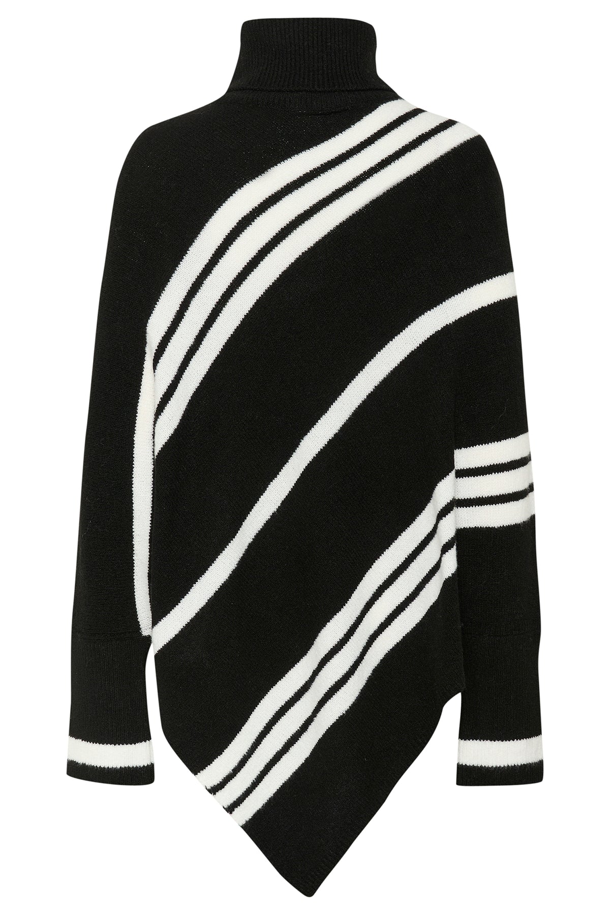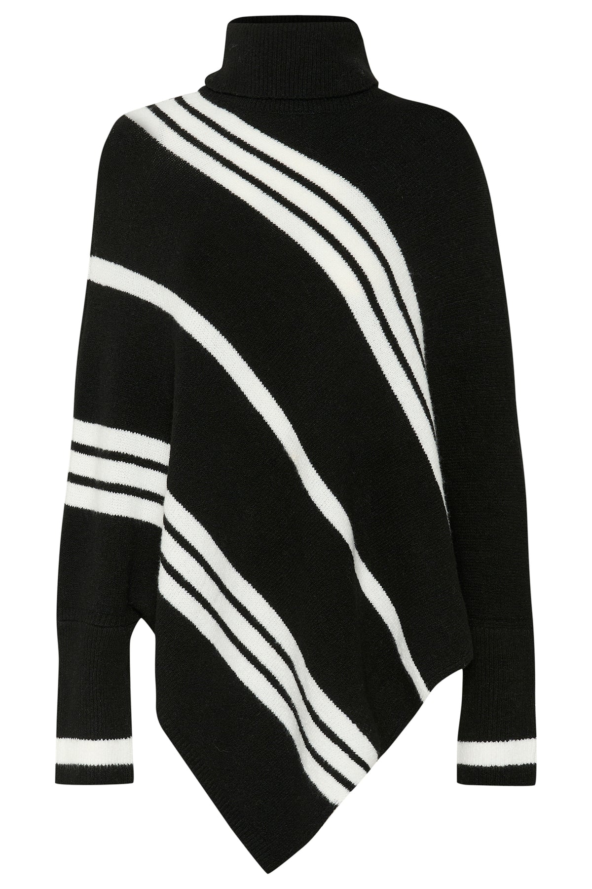 A statement knit with Scandinavian charm, the Cream Clothing CRKuma Black Eggnog Stripe Turtleneck Poncho blends bold patterning with relaxed structure. Its asymmetric hem and soft drape offer a confident layer for transitional edits.