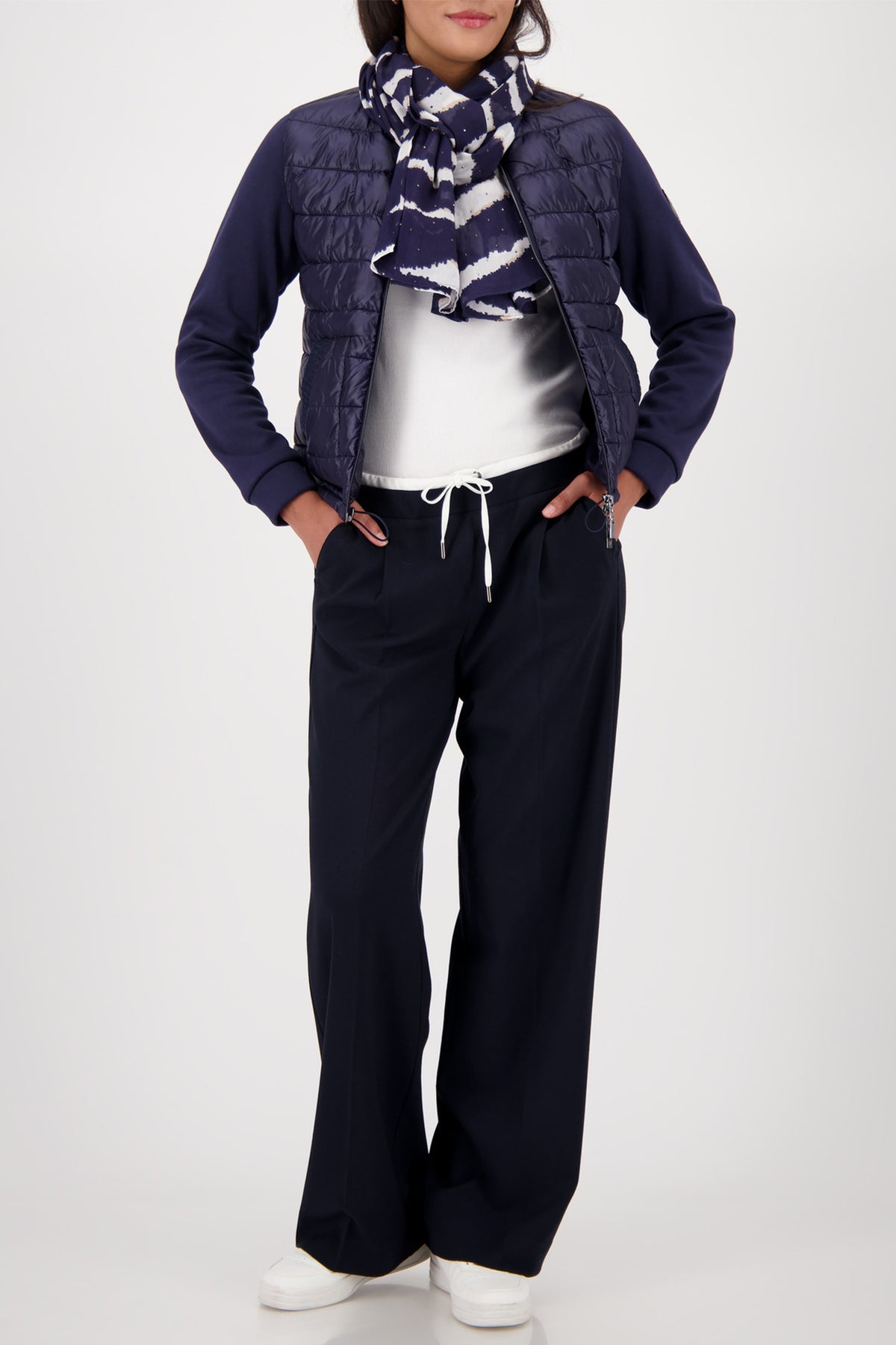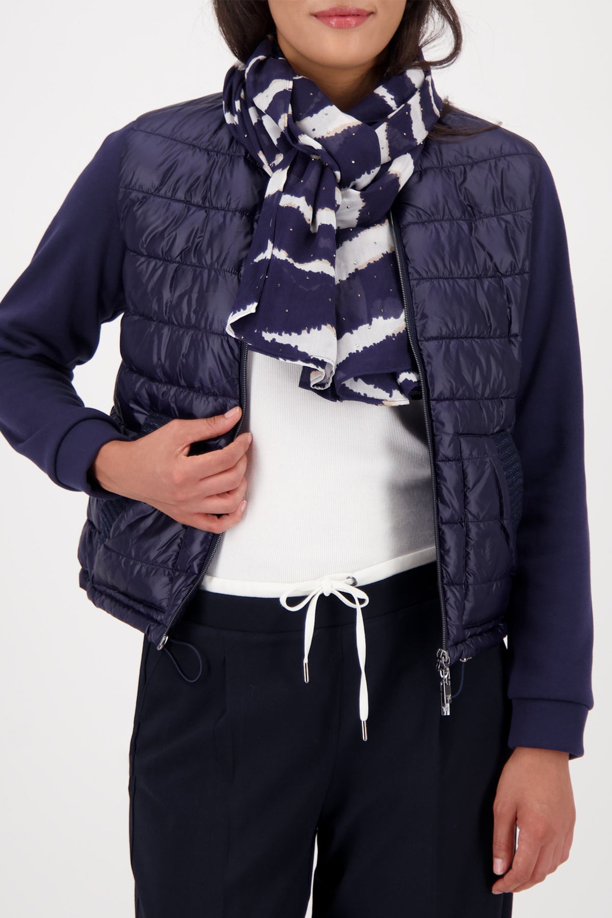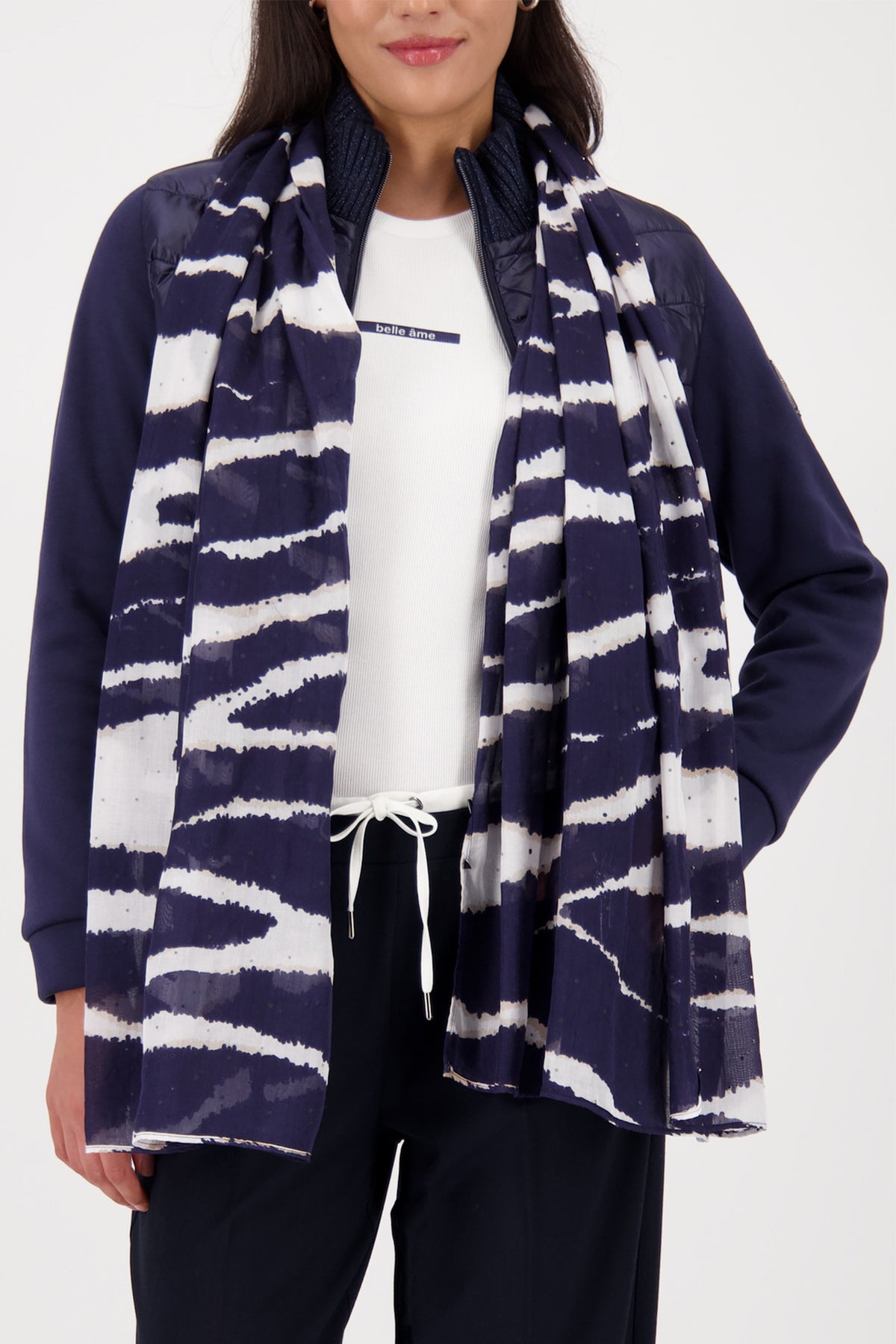 A graphic accent with lightweight texture, the Monari 809158 Night Sky Navy Stripe Scarf blends abstract patterning with soft drape. Its brushstroke-style stripes and subtle rhinestone detail offer dynamic contrast across layered edits.