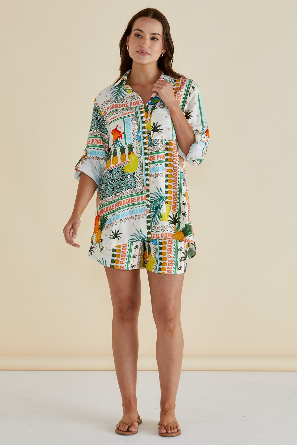 Style this with white linen trousers and flat sandals for effortless holiday ease. Layer it over a simple white vest dress for a more coordinated look, or wear it solo with neutral shorts for a relaxed weekend vibe. The bold, playful print works beautifully as a statement piece, so keep accessories simple and minimal. Perfect for pairing with neutral bottoms that won't compete with the vibrant design.