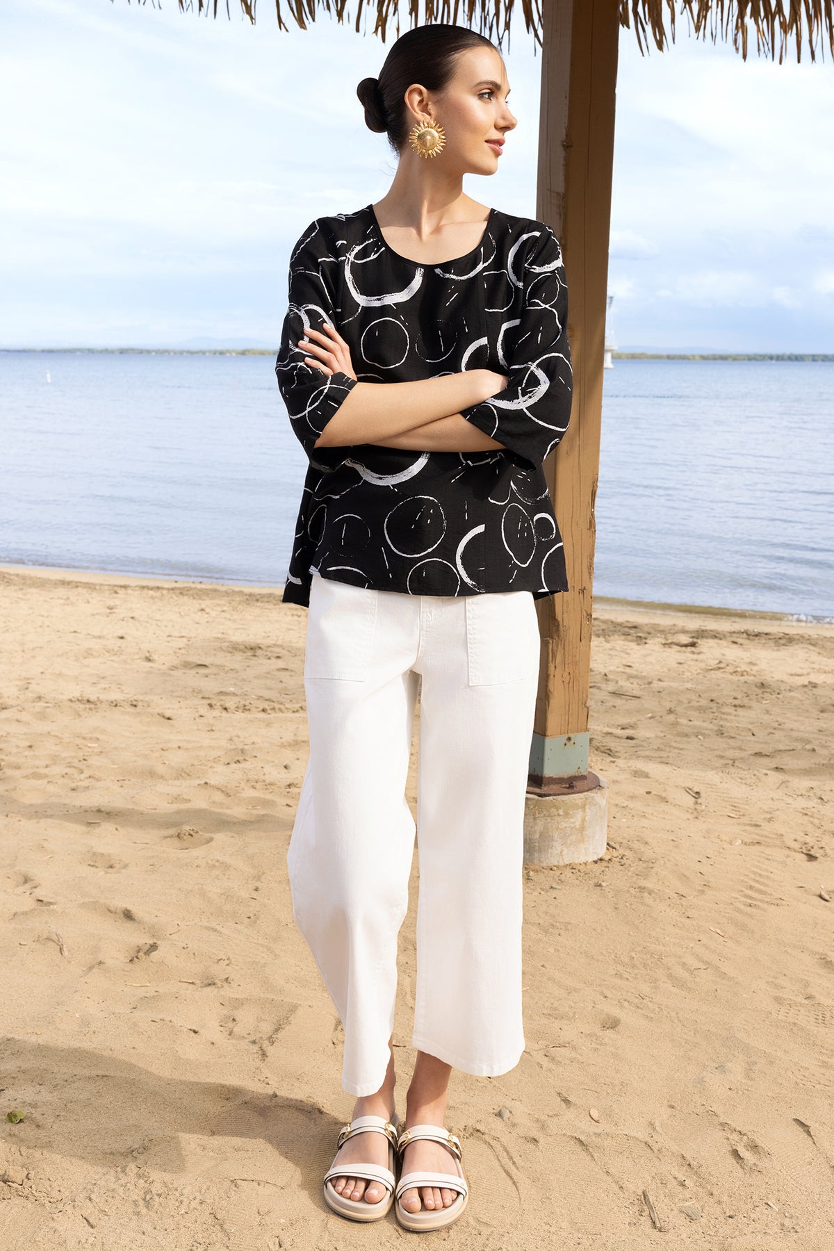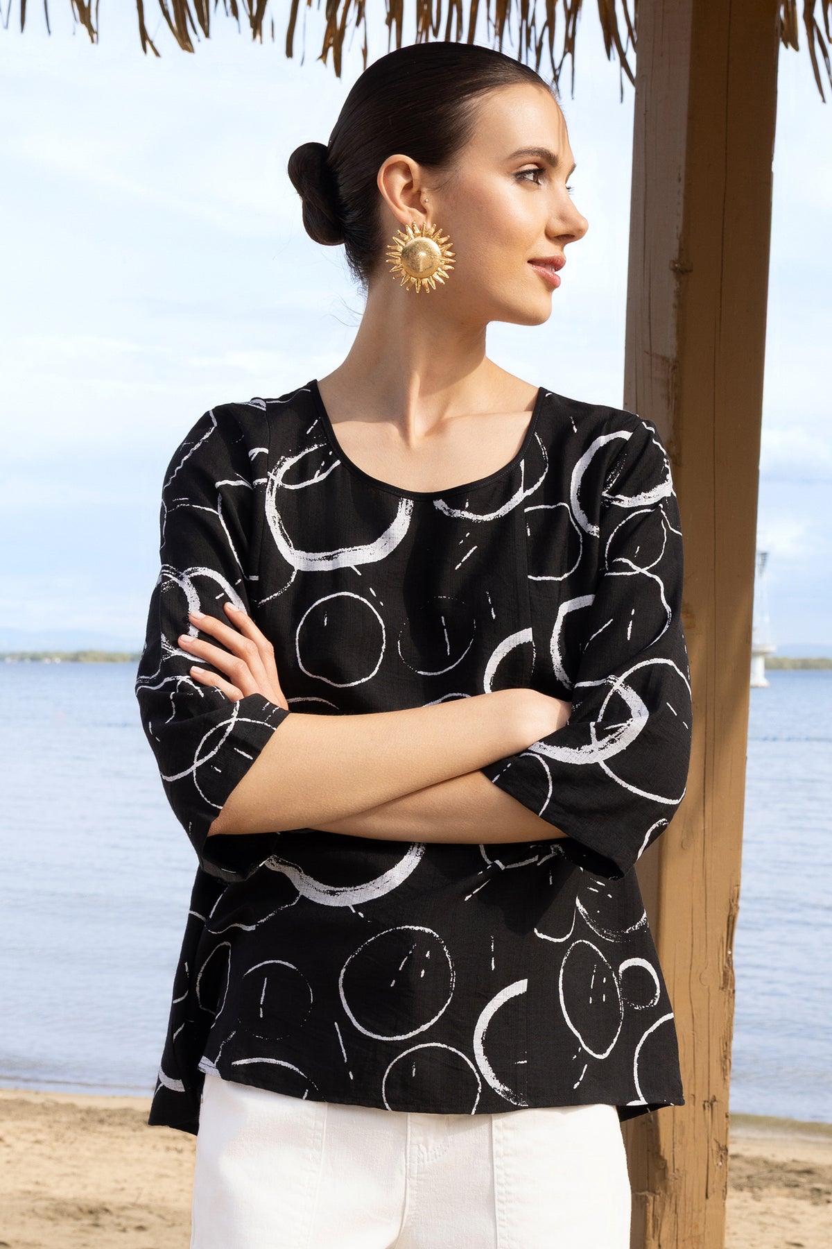Style this circle print top with white jeans for a fresh, monochrome outfit, or dress it up with tailored trousers and statement earrings for a chic, contemporary look.