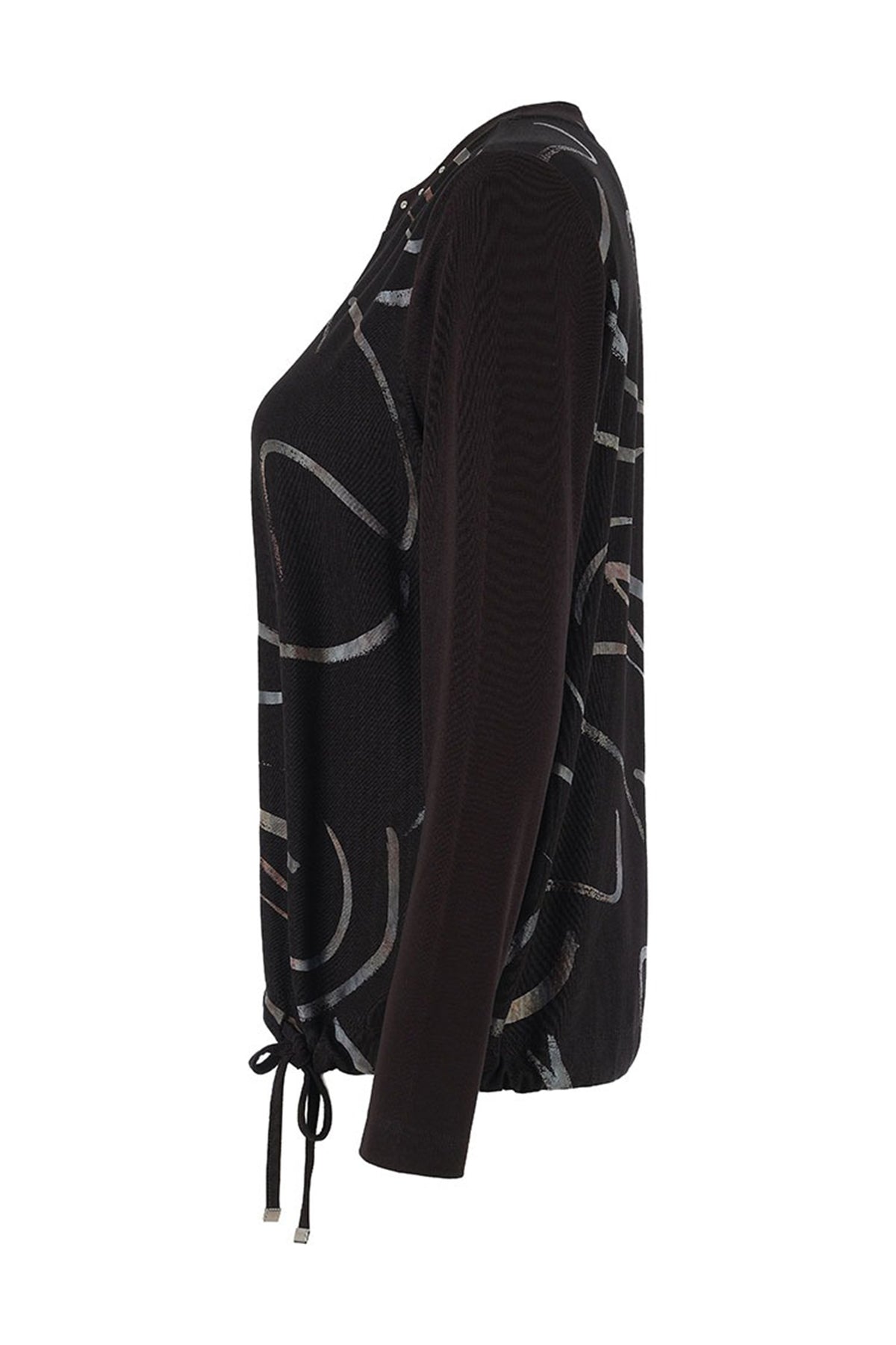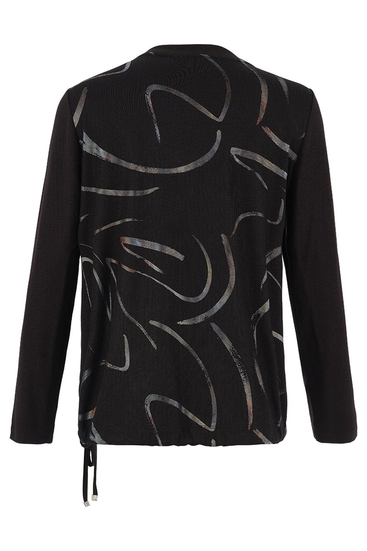 Make a confident statement with the Dolcezza 75120 Black Dancing In The Dark Print Top, a bold blend of abstract artistry and modern comfort. The front showcases swirling brushstroke-style curves in soft grey and white against a black backdrop, while the back continues the motif with dynamic circular linework and a drawstring hem for added shape and flair.