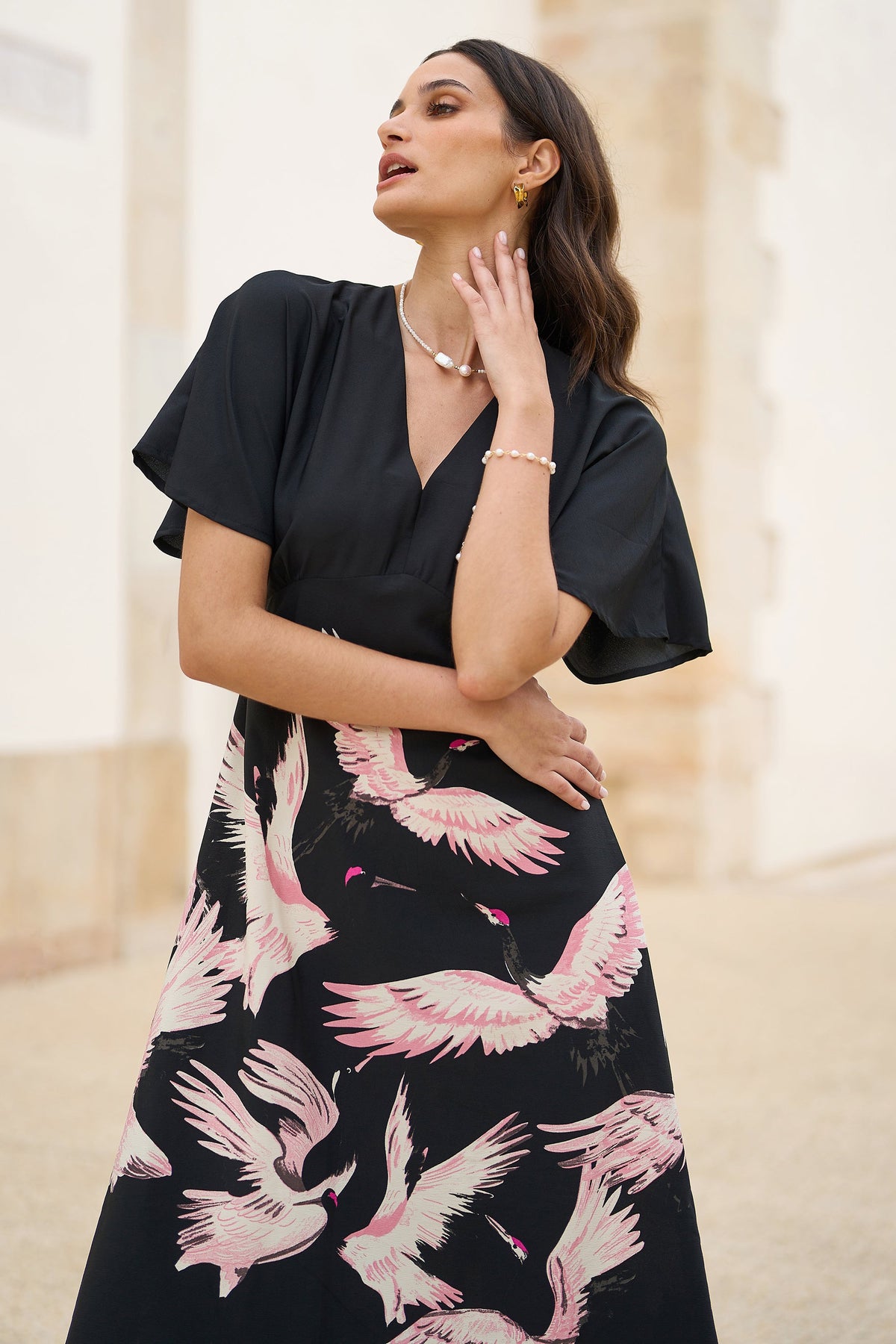 What could be better than a new take on a classic shape? One with a decadent Crane print, lovingly designed in house. The supersoft lightweight recycled fabric of this midi dress drapes over the knee in a relaxed shape, balanced by flared sleeves and a pretty V-neckline. Don't be surprised if you turn heads.