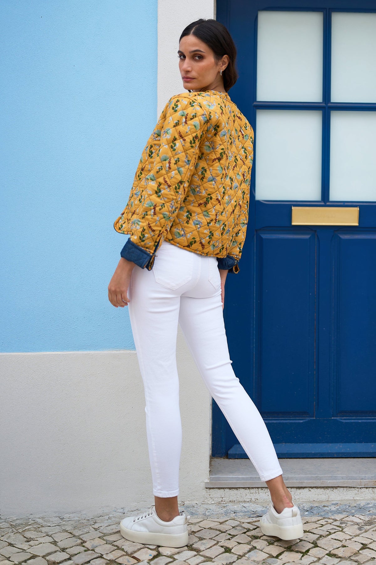 Yumi Blue Chambray Quilted Jacket With Reversible Floral Lining