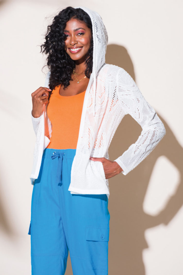 Alison Sheri 43182 White Crochet Hooded Zip Front Cardigan Jacket