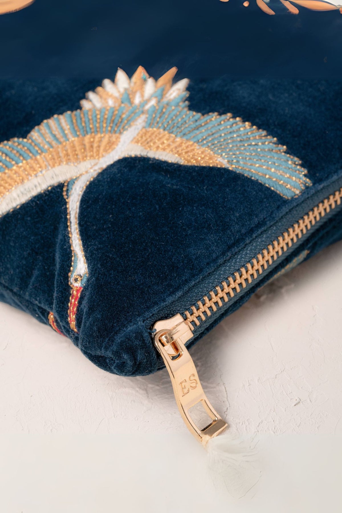 Indulge in the intricate embroidery of our Wild Crane pattern, which embraces the unbridled splendour of autumnal skies and landscapes. Radiate positivity with this design, ideal for those with a carefree spirit. Elevate your style and organisation with the Elizabeth Scarlett Ink Blue Cranes Everyday Velvet Pouch, featuring delicate embroidery on a durable, luxurious base. Perfectly sized for your daily essentials, it effortlessly fits in your handbag or can be carried as a chic clutch.