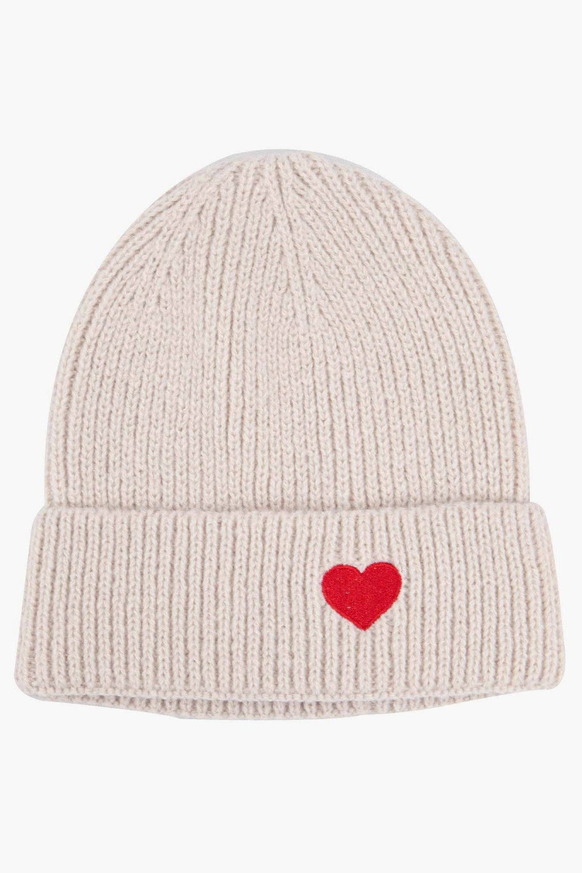 Cream & Red Heart Embroidered Beanie Hat