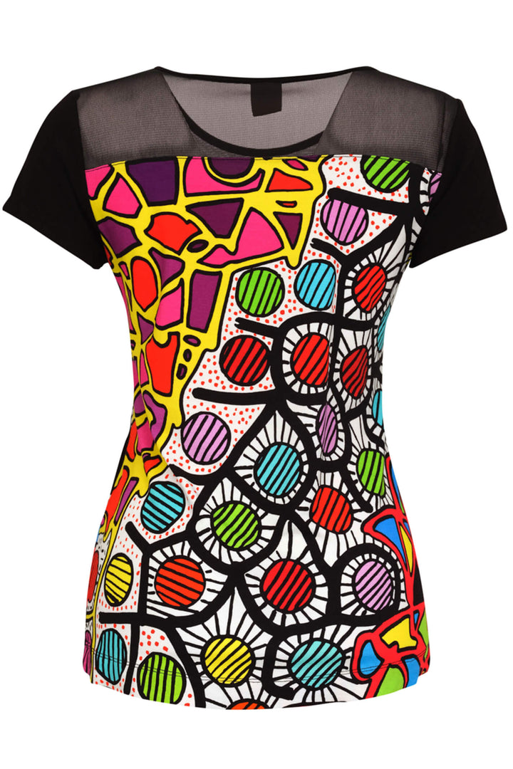 Featuring a bold, colourful print, this top is a must-have unique, wearable art piece for your wardrobe. The asymmetrical mesh detailing to the chest gives a super stylish look, whilst the flattering rounded neckline and short-length sleeves make it an easy-to-wear piece. Perfectly lightweight for this season, this top will become a go-to.