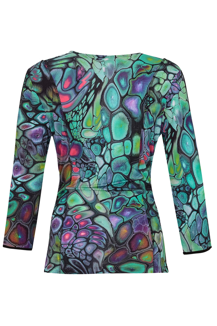 The Dolcezza 73661 Green Maria Brookes Print Wrap Style Top features a stunning artwork print by English artist Maria Brookes named 'Fantasy'.