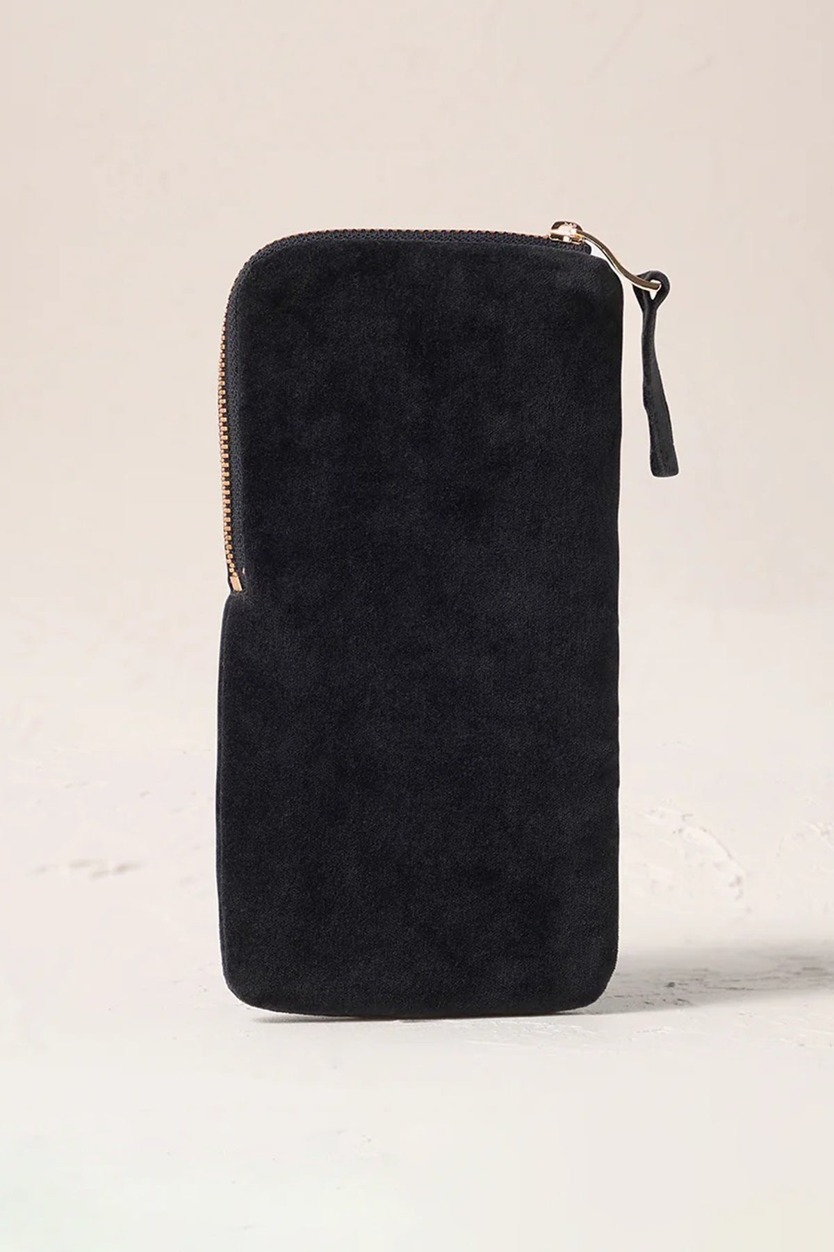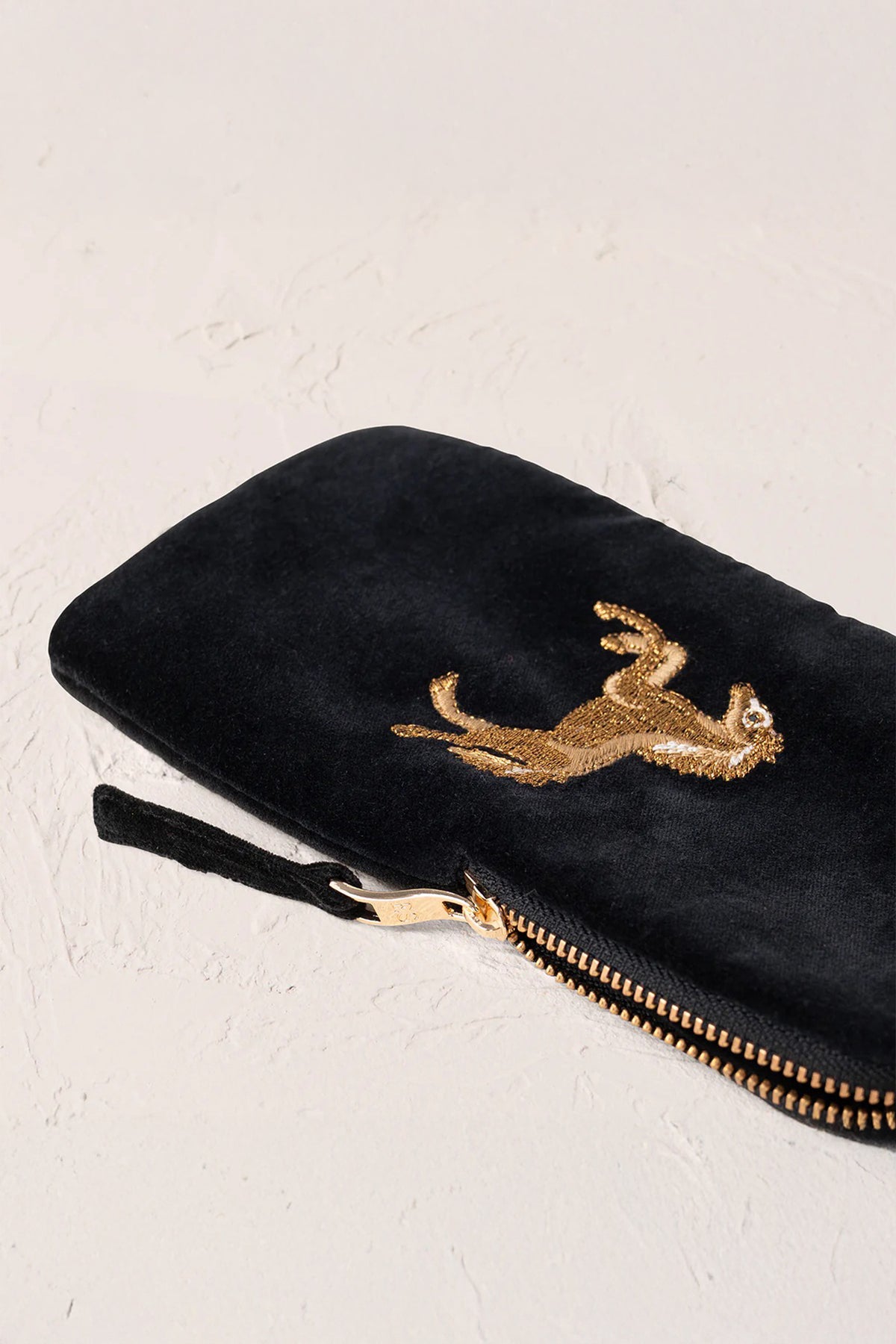 Elizabeth Scarlett Charcoal Wild Horses Glasses Case is a padded velvet zip case embroidered with golden wild horses—ideal for protecting eyewear with a touch of folklore charm. Designed for everyday elegance, it blends practicality with romantic detail.