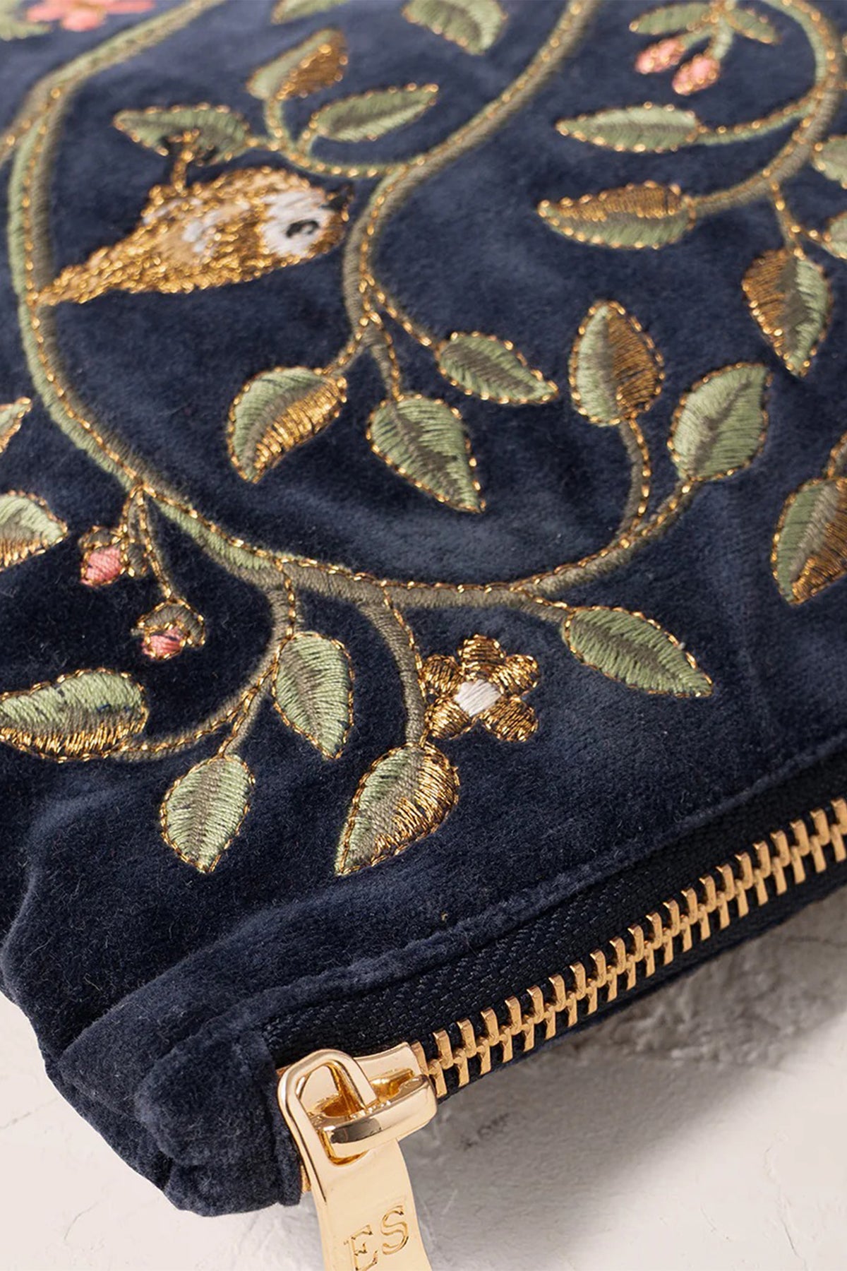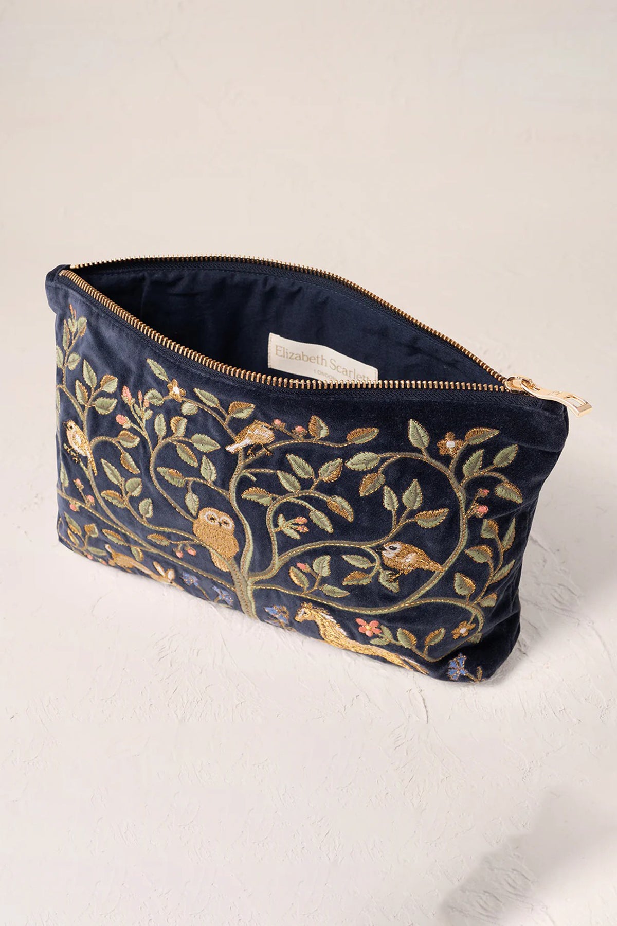 Elizabeth Scarlett Indigo Tree of Life Everyday Pouch is a velvet zip pouch embroidered with woodland animals and enchanted foliage—ideal for storing daily essentials or using as a clutch. Inspired by folklore, it blends artistry with practical elegance.