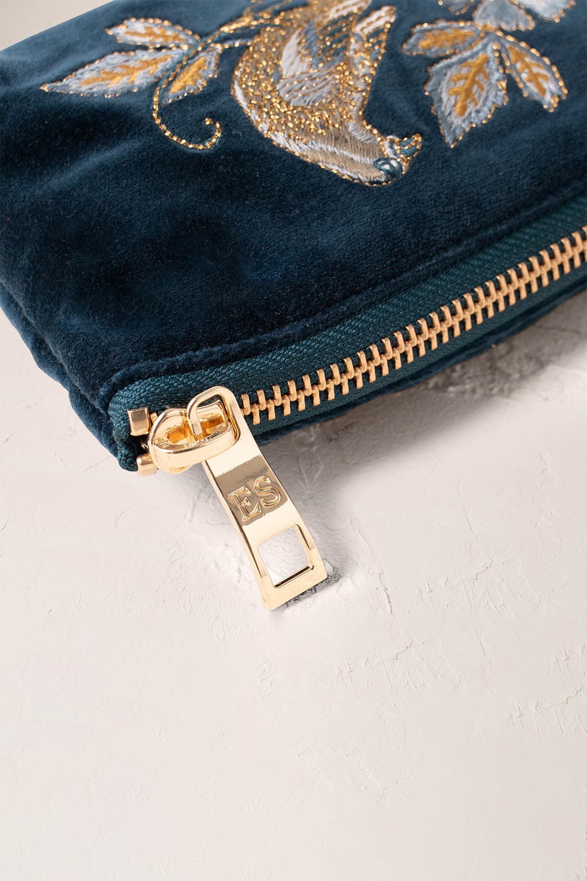 Elizabeth Scarlett Ink Blue Botanical Birds Coin Purse is a compact velvet zip pouch embroidered with vibrant birds and climbing vines—ideal for storing coins, jewellery, or travel-sized essentials. Designed with a romantic garden motif, it blends artistry with everyday function.