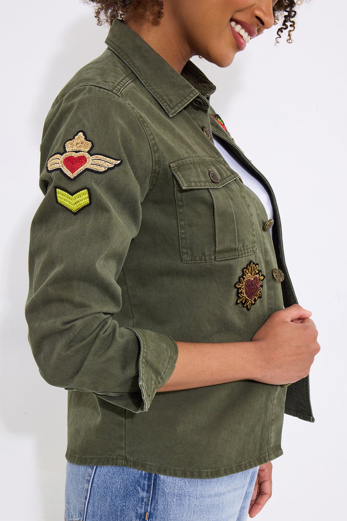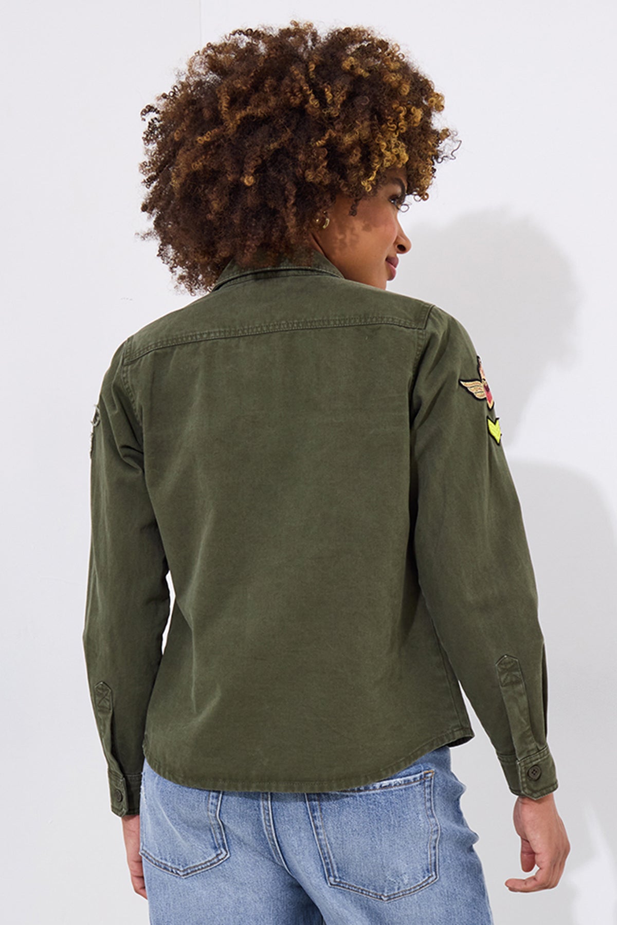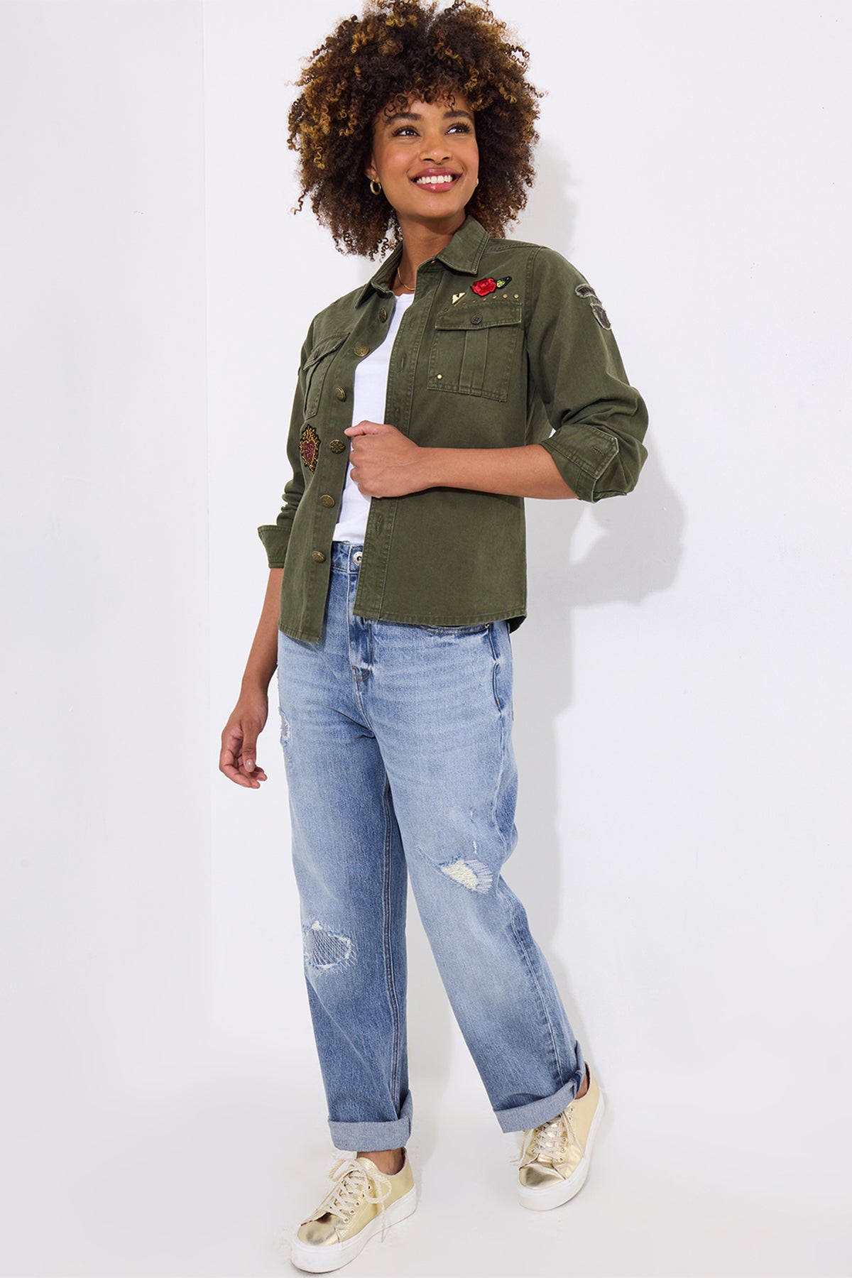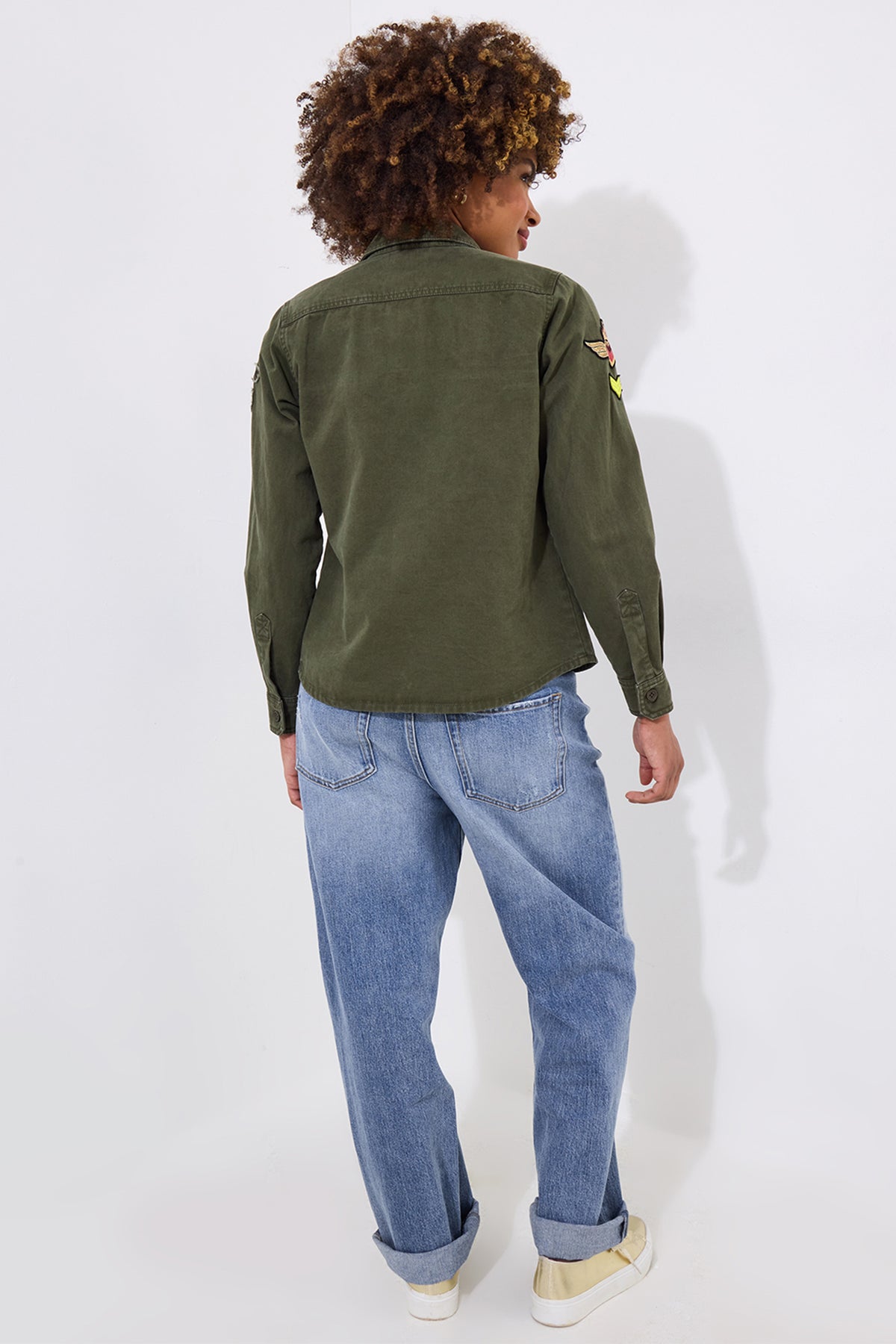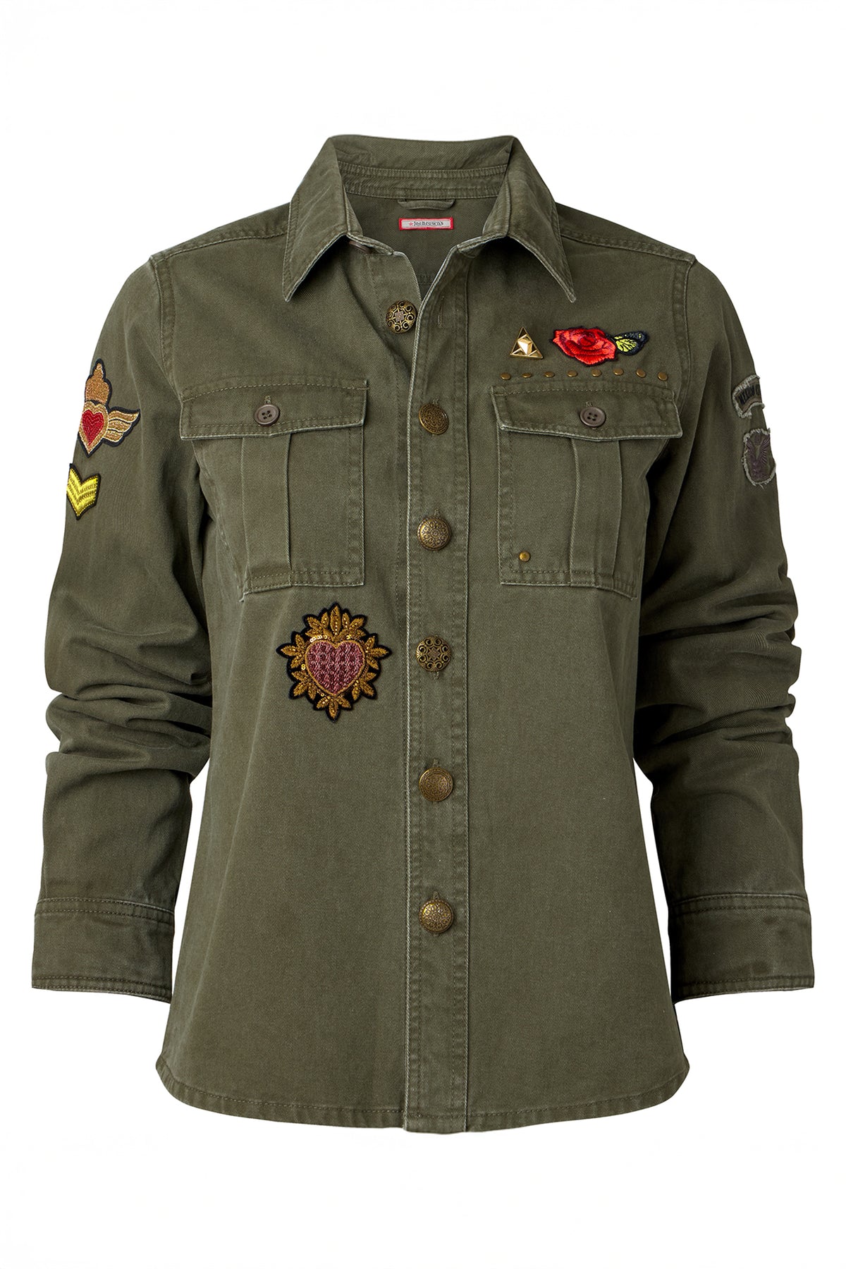 Meet our relaxed fit khaki shirt, the new statement piece for your spring wardrobe. Dotted with applique detail and unique badges, it brings a little edge and a whole lot of personality. Made to flatter so you'll feel fabulous all season, this is a remarkable look that you'll love to style.