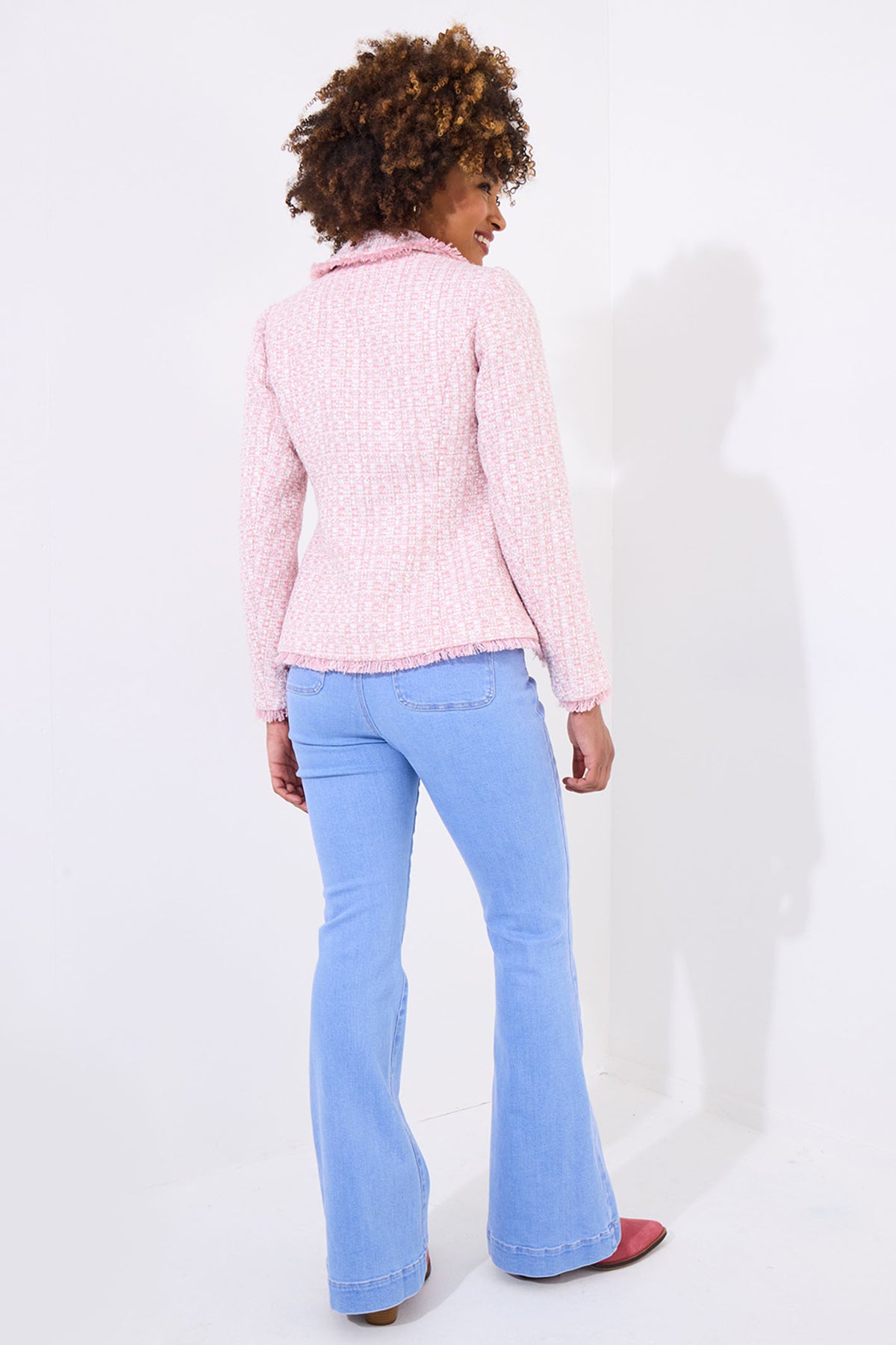 This tweed jacket is a dreamy spring essential. The soft pastel pink design is enhanced with frayed edges and a chic collar, ensuring it always makes an impact. Offering a feminine twist on smart styling, it’s versatile enough to pair with everything from jeans to skirts and blouses to camis.