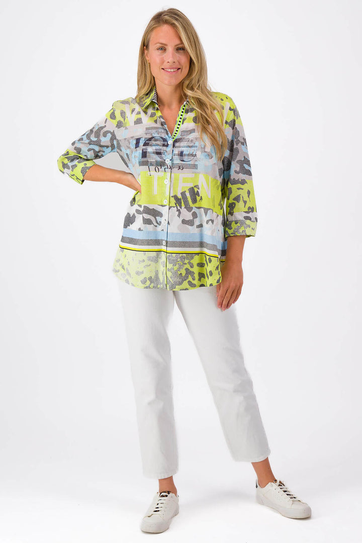 Adorn yourself with this Just White J2778 Lemon Drop printed shirt, exuding sophistication. Its collared neckline, front button closure, and 3/4 length sleeves with buttoned cuffs create a stunning silhouette that looks fabulous. Its multi-print design with dazzling stud detailing and light weight fabric adds unique charm and the small side split detail to the hemline adds subtle detail. Make a lasting impression this season for the right reasons.