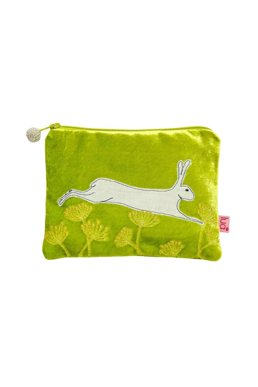 Carry all your essentials in style with the Lua Lime Embroidered Hare Velvet Purse! Made from super soft velvet, this purse features an embroidered hare design. The zip top closure with a beaded ball zip pull adds a touch of elegance, while the included coin purse keeps your change organized.