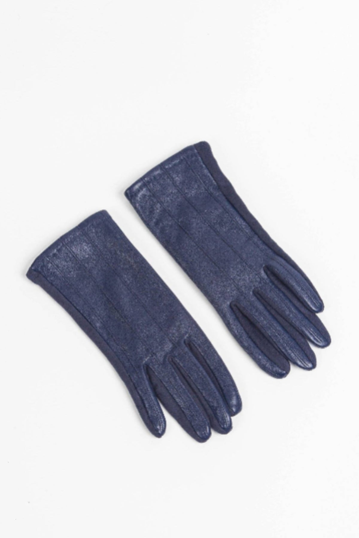 Keep your hands warm and your phone accessible with these navy blue touch screen gloves. Made from soft vegan leather with stylish vertical stitching, they let you tap and swipe without removing your gloves. One size fits all.