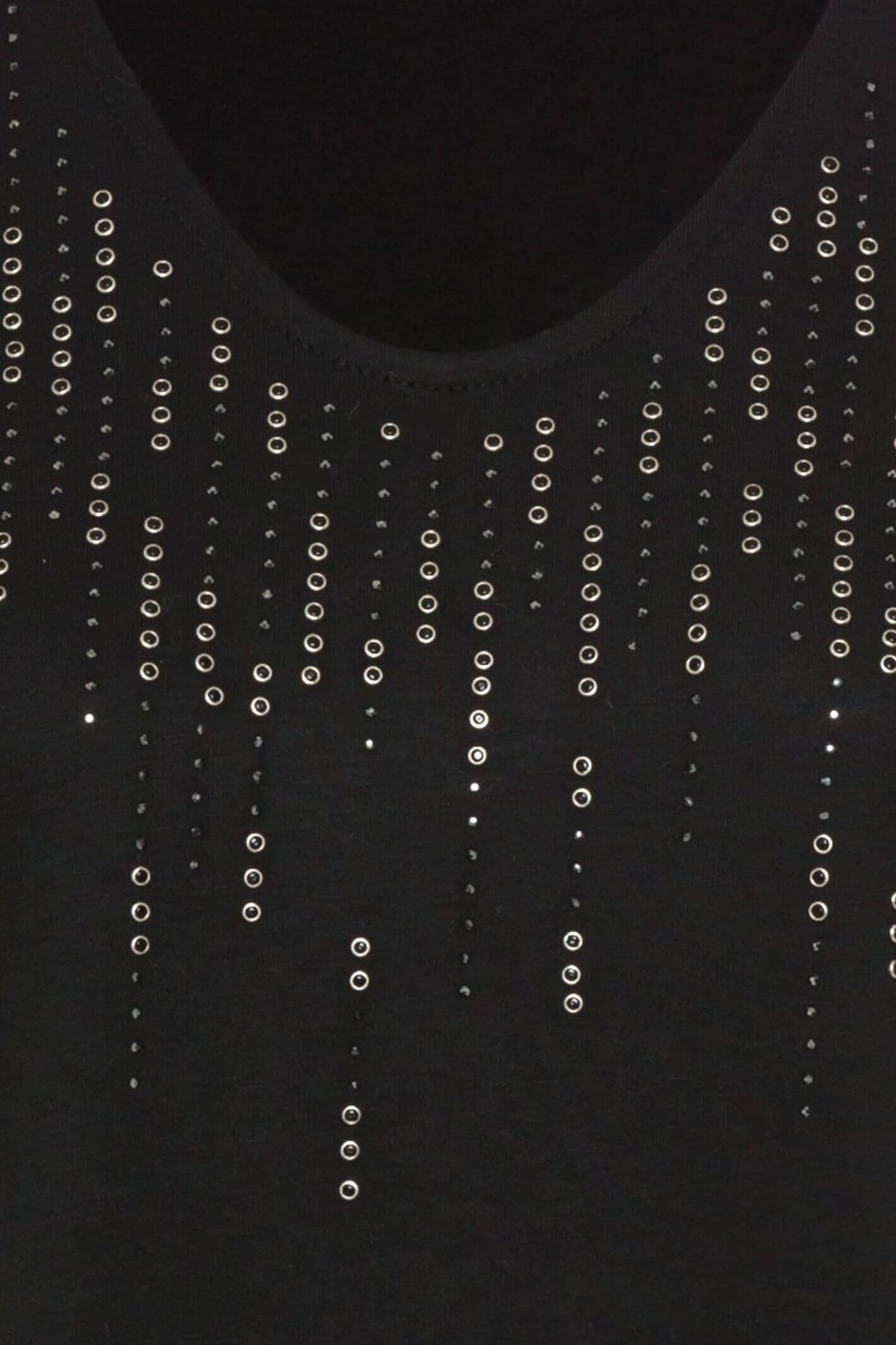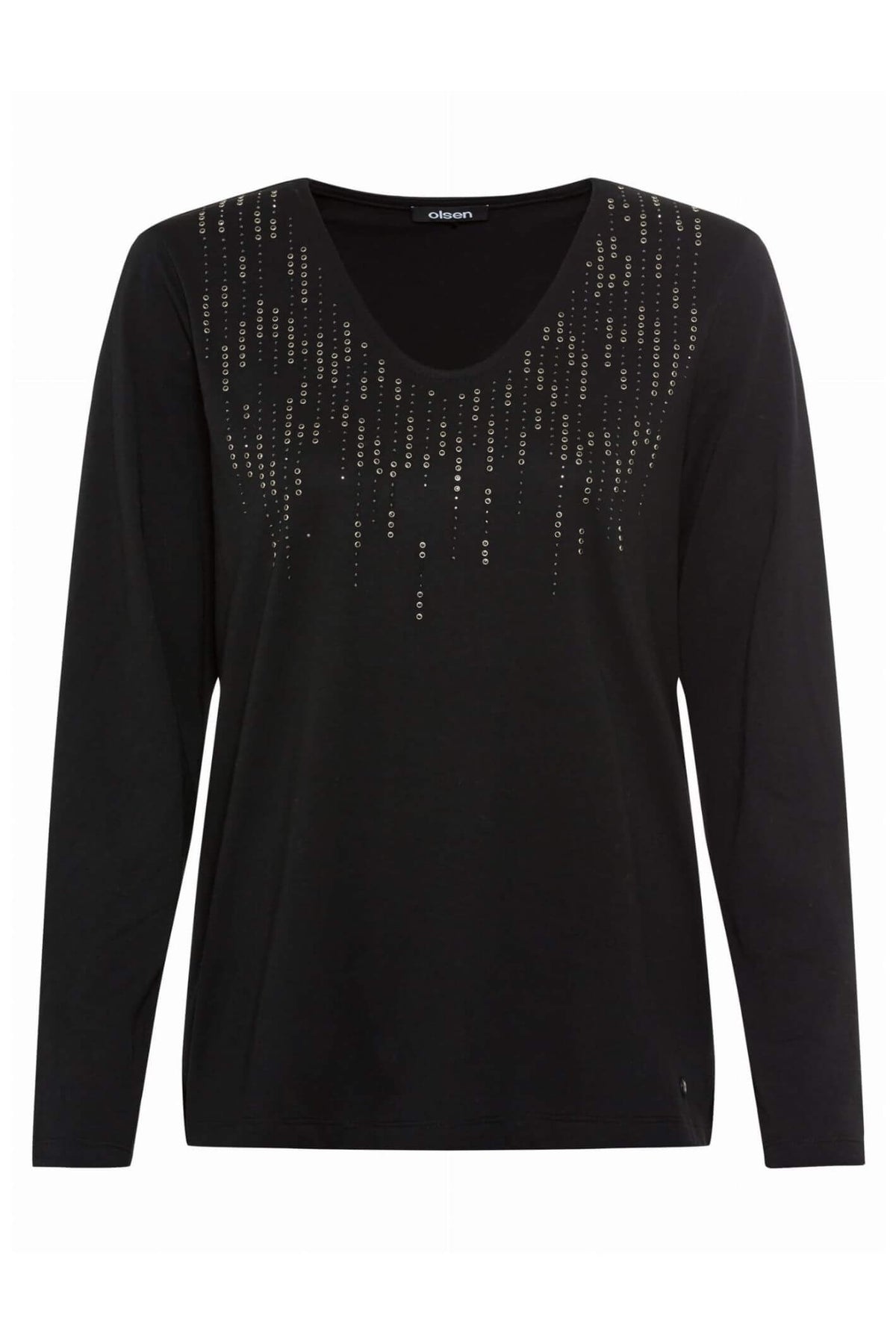 This Olsen 11104676 Black Jewel Embellished Top is the perfect piece for any wardrobe. Crafted from a lightweight fabric, it features a flattering v-shaped neckline, full length sleeves, small side split detailing to the hemline, and eye-catching dazzling diamante detailing to the front. Effortlessly chic and versatile, it's sure to become a wardrobe favourite.