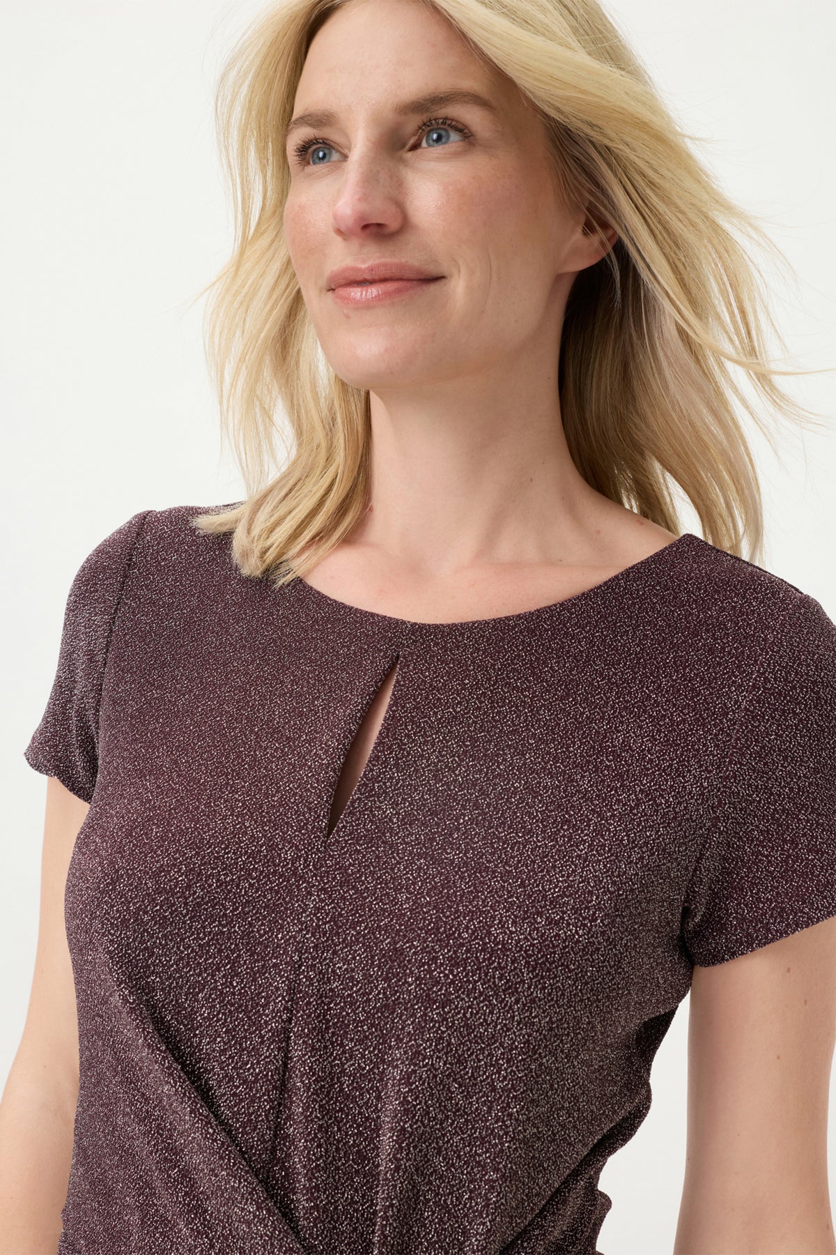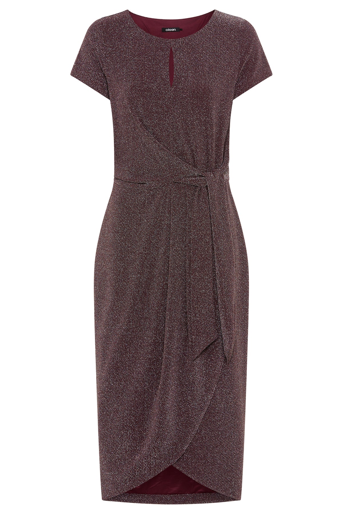 Olsen 13002059 Dark Wine Lurex Shimmer Midi Cocktail Dress is a wrap‑style midi dress designed for festive elegance—crafted in stretch lurex jersey with a tulip hem and flattering waist tie.