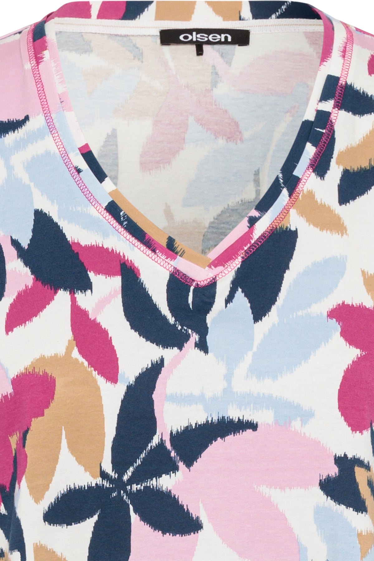 Olsen Boysenberry Pink Leaf Print Cotton V-Neck T-Shirt 11105128 70077