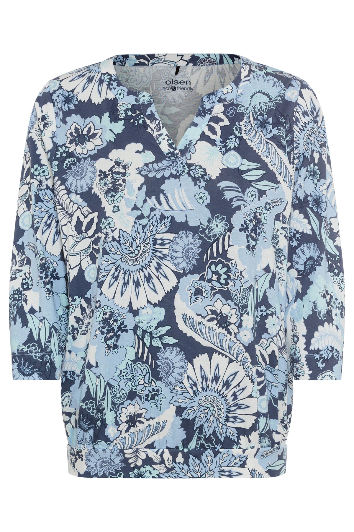 Infuse your wardrobe with coastal charm with the Olsen Top Coast Vibes in Ink Blue Floral Print (Style No. 11104984). This lightweight, 3/4 sleeve top boasts a striking floral pattern in calming shades of blue, perfect for adding a refreshing touch to your everyday or holiday look. Ideal for casual outings or relaxed evenings, this top combines comfort with effortless style.
