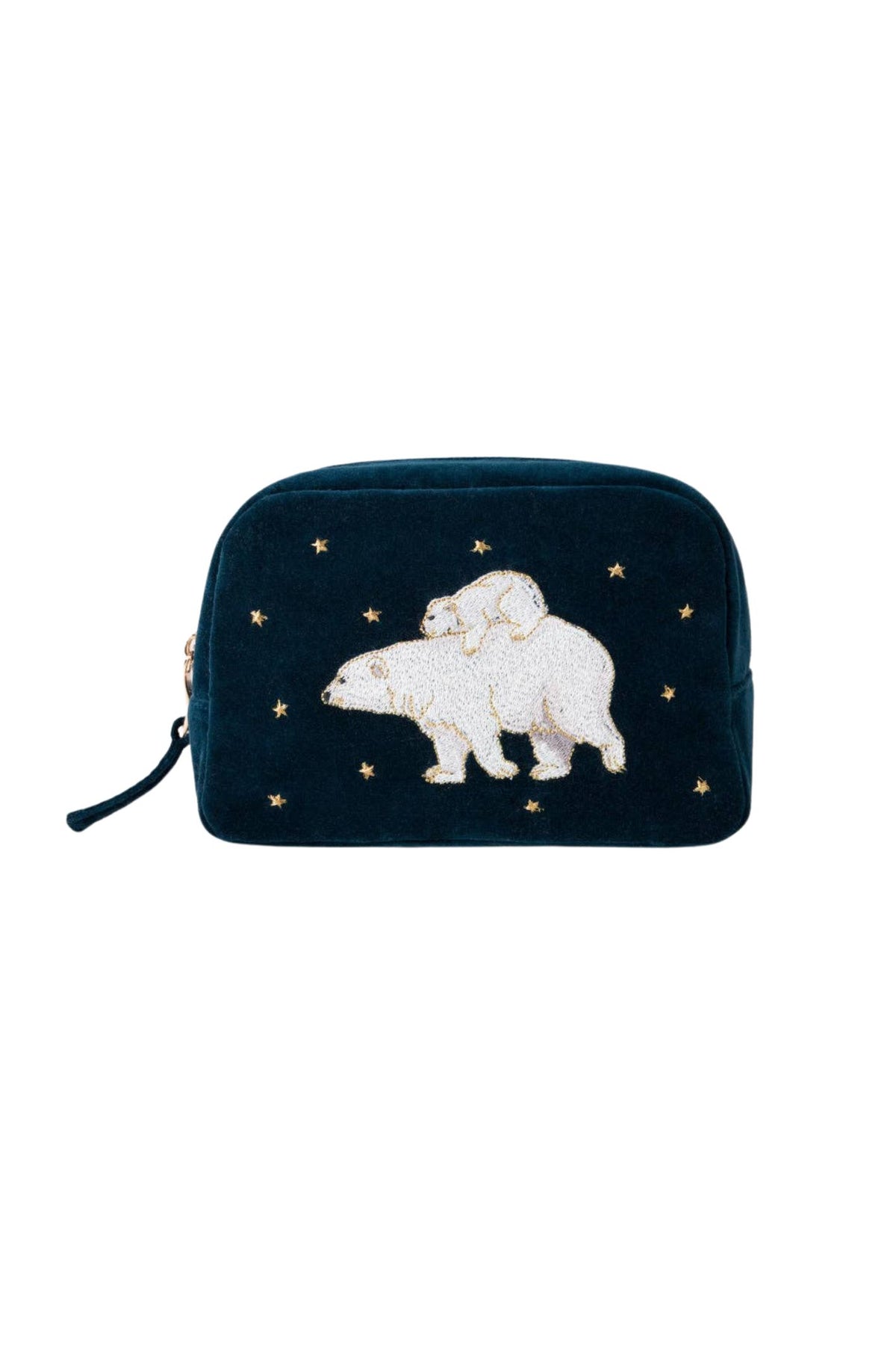 Add a touch of luxury and color to your day with the Elizabeth Scarlett Ink Blue Polar Bear Velvet Cosmetics Bag. Perfectly sized for makeup, skincare, and more, this washable bag features charming polar bear embroidery, metallic gold stars, and a convenient gold zip. No need to worry about messy mishaps as you can machine wash this bag!