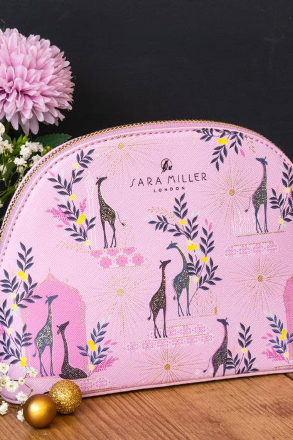 Upgrade your beauty bag with this medium-sized, stylish cosmetic bag featuring the quirky Savannah print. Made of soft pink vegan leather adorned with lounging giraffes surrounded by tropical greenery, it's perfect for all your weekend beauty must-haves. The bag is lined with easy-to-clean fabric and has a unique zip closure with a custom Sara Miller zip-pull. Impressively crafted, it adds a touch of luxury and charm to any bathroom or vanity, and makes an impeccable gift.