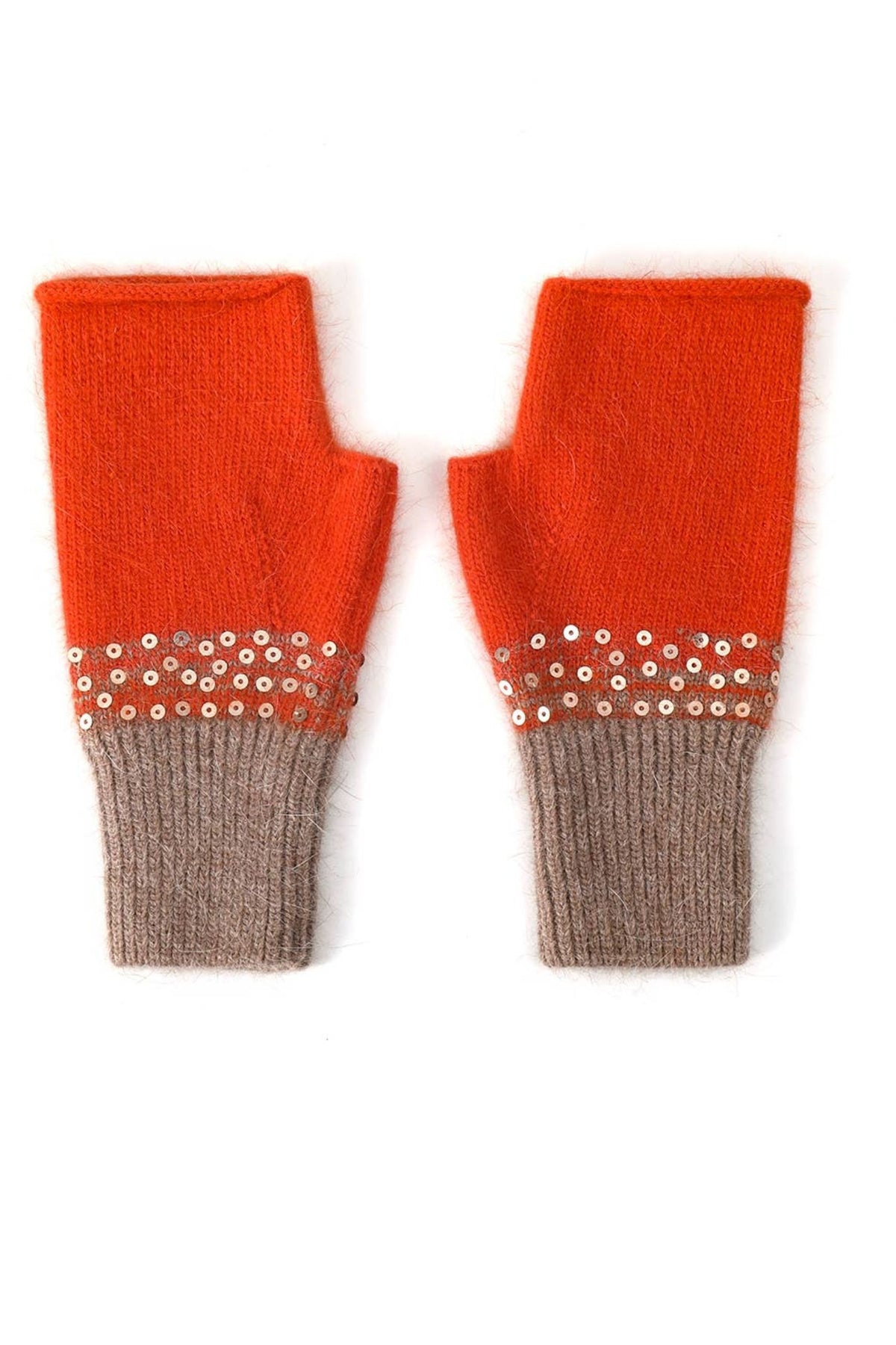 Indulge in a world of cozy sophistication with these elegant fingerless gloves. Made with soft tones, these gloves offer warmth and practicality. The top half features a rich colour that smoothly blends into a lighter shade at the wrist, creating a stylish two-tone look. Along the transition, delicate sequins embellish, adding a touch of sparkle to catch the eye. Perfect for those who need to use their fingers for typing or texting, these gloves are not only functional but also exude an air of sophistication. Whether you're looking to accessorise your winter wardrobe or searching for a unique gift, these gloves are a must-have. Made with a blend of cashmere and wool.